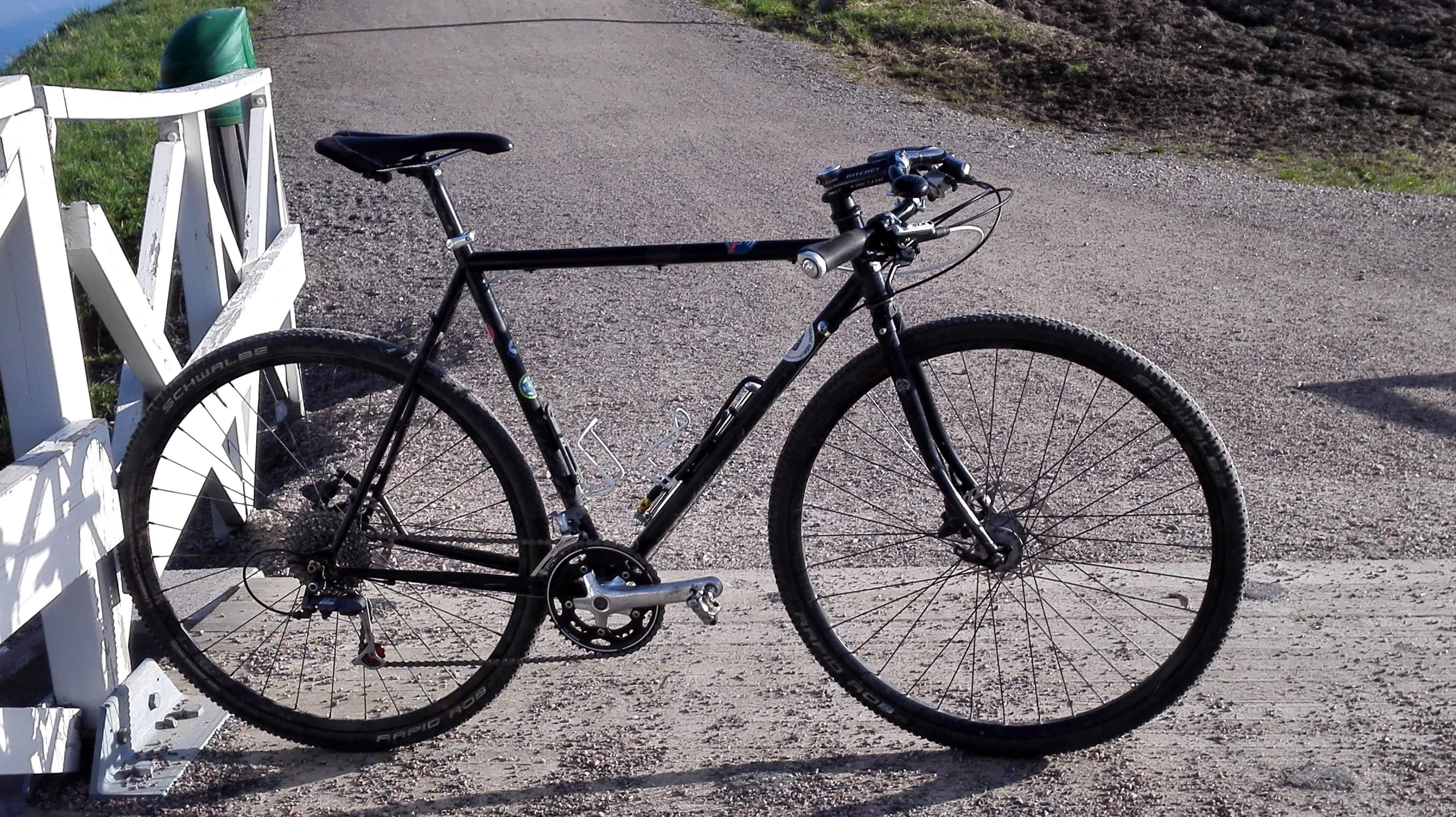 Nykyinen kaupunkimaasturi, parin kilsan duunimatkaa yms varten. R-Cyclesin Dacon-runko ysäriltä, 1x10 ja kalliimasta pyörästä pois jäänyttä rompetta.