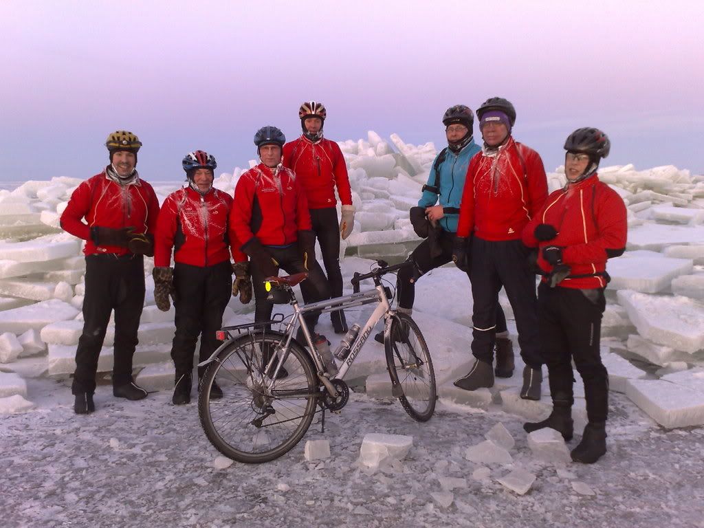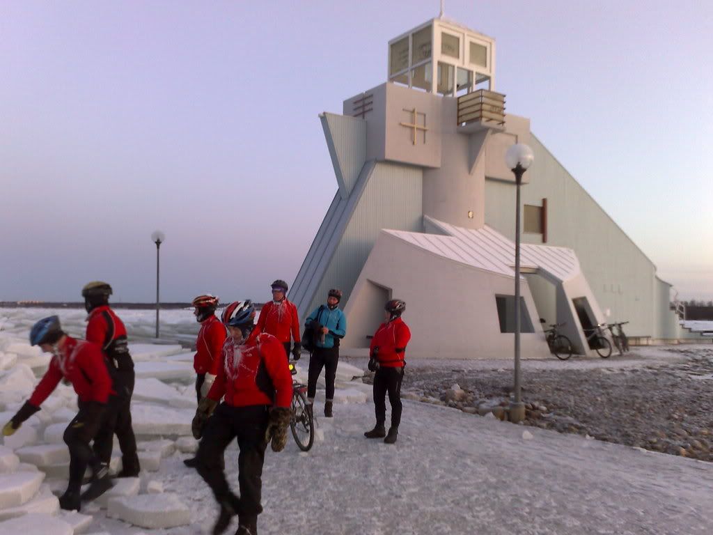 Katuvalojen loisteeseen päästiin taas Heikkilänkankaalla, josta matkattiin pyörätietä pitkin moottoritien varteen. Kemiran portin kautta jatkettiin Ruskoon ja Kuivasjärvelle. Linnanmaan kautta ajeltiin Toppilaan ja Nallikariin meren rannalle. Merijää oli tänään kiiltävän sinistä ja sileää, kun käväistiin rannalla kääntymässä. Kuvaaja nappasi muutaman kuvan porukasta ennen kahville menoa.