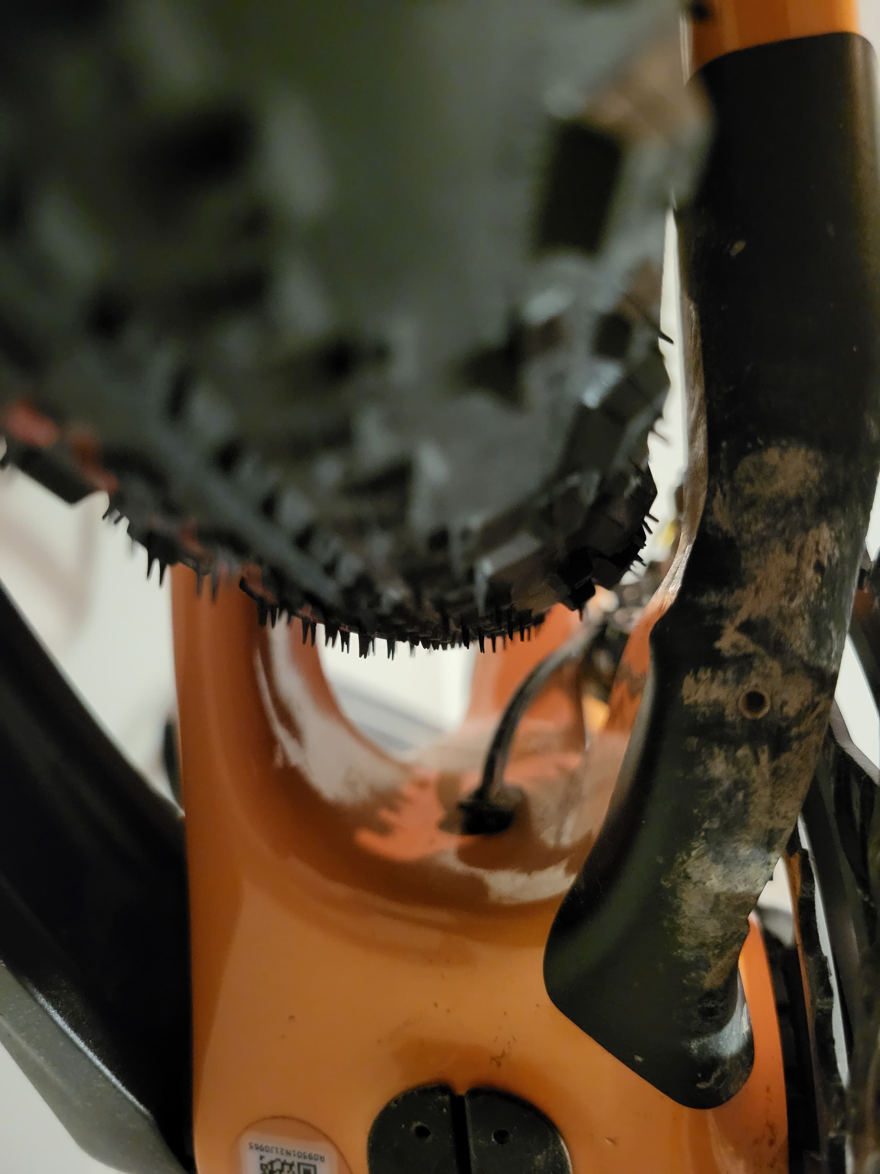 Tosiaan kuten paaton totesi niin tuo kuva hämää. Renkaan ja satulaputken väliin mahtuu 5mm kuusiokoloavain. Ahtain kohta on chainstayn ja reunanappuloiden väli, mutta sielläkin näyttäisi olevan noin 4mm tilaa per puoli. Kaikki kriittiset kohdat suojattu kuitenkin varmuuden vuoksi kiveniskuteipillä. Yllättävän hyvin jäi tilaa tuollakin renkaalla niin tuskin tulee ongelmia uusilla kiekoillakaan joissa 27mm ID verrattuna näihin 24mm ID kiekkoihin.