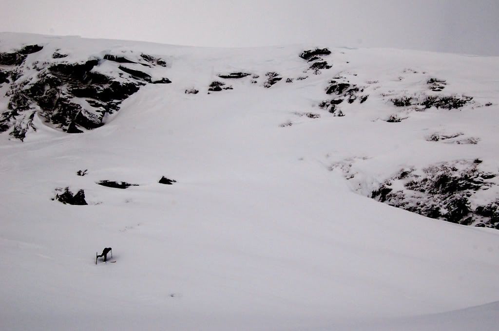Tarvoin mäen juureen ja könysin matkalla parisattaa kertaa turvalleen. Lunta oli välliin poloveen asti, välliin puoleen väliin mastoa. Eka pieni mutta virkeä lumivyöry lähti heti siinä mäjen juurella ja hulahti jalakojen läpi, horjutteli kevyesti tasapainoa. Lähin kierteleen ja kaarteleen kolokytäasteista rintuutta ylös kohti sitä fucking kourua, ja laukasin noin kymmenen muuta vyöryä siinä matkalla parin tunnin aikana. Isoin oli yli kymmenen metriä leviä ja puoli metriä paksu.