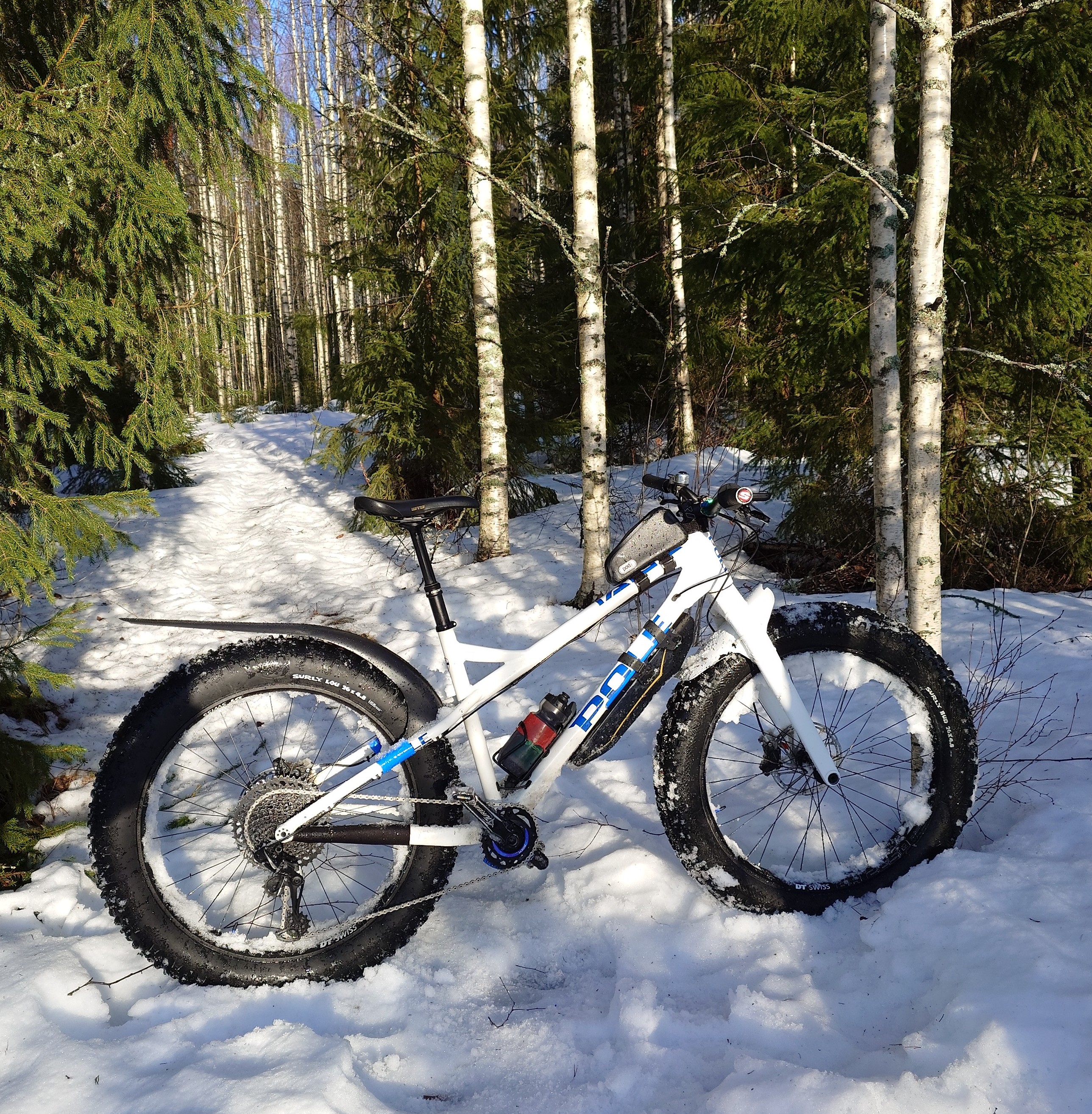Mulla alkoi koko pyöräily uudestaan läskipyörällä ja talviajolla. Luulin ettei kapeilla renkailla kannatta edes mennä kapeille talvipoluille. Olin väärässä. Läski on luonnollisesti parempi pehmeässä lumessa ja erittäin kiva ajella esim. Meren jäällä missä on kunnon lumikerros päällä ja missä ei pysty ajamaan edes kapeimmilla renkailla. Vaihdoin sen keväällä jäykkäperään, erittäin onnistunut päätös. Paljon parempi kaikkeen muuhun ajoon paitsi edellä mainittuun. Kovilla poluilla paljon kivempi, siis semmoisilla mitä täällä Helsingissä on. Kyllä se läskikin haukkaa sinne pehmeään jos ajaa vähän polulta ohi, toki ei vältämättä niin helposti.Lainaus: