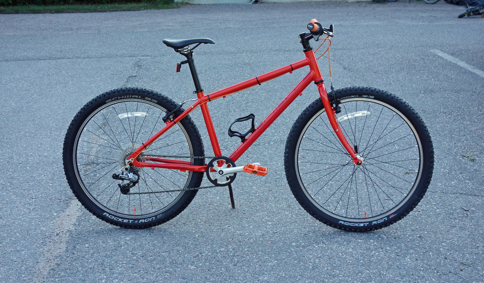 29+:n ajo-ominaisuudet on joo jänskät. Asvaltilla ohjaus vetelee ihan omiaan mutta polulla meno on tarkkaa. Lyhyen takapään todellakin huomaa, tosi ketterä laite ja keulakin nousee ilman isompia repimisiä. Pitoa: on! Tosin noitten Maxxisin renkaiden mutaominaisuudet ovat ihan surkeat, lähtee puskemaan ihan minne sattuu. Muhkukumi myös tasoittaa menoa niin, ettei ainakaan tuollaisella 40 km reipasvauhtisella lenkillä ole selkä väsynyt. Yllätyin positiivisesti kuinka hyvin tuo laite rullaa ja kiihtyy, polulla laite tuntuu kuin turboahdetulta kaksysiltä. Renkaiden ja kiekkojen painon huomaa oikeastaan vain asvaltilla ylämäkeen kihnuttaessa.