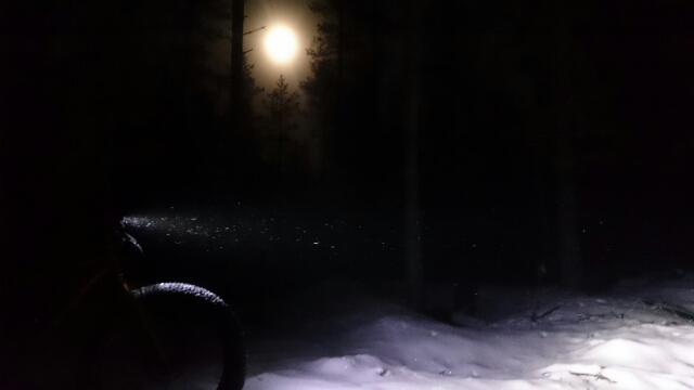On kyllä nyt ollut polkua paljon. Eilen(kin) olisi taas toivonut että olisi ollut joku pikkujärkkäri povarissa, jännä sumu kimalteli kuun ja lamppujen valoissa.