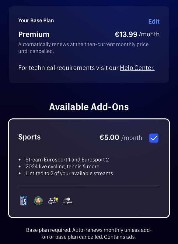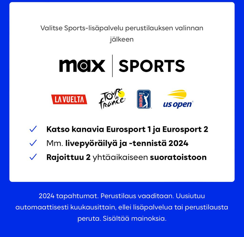 Itteleä on tuo max alkuperäinen 4.99€/kk tilaus, siihen tuo sports add-on 5€/kk on ihan selkeä. Mutta ei kai tässä menetä jollain tapaa tuota edullista perustilausta?