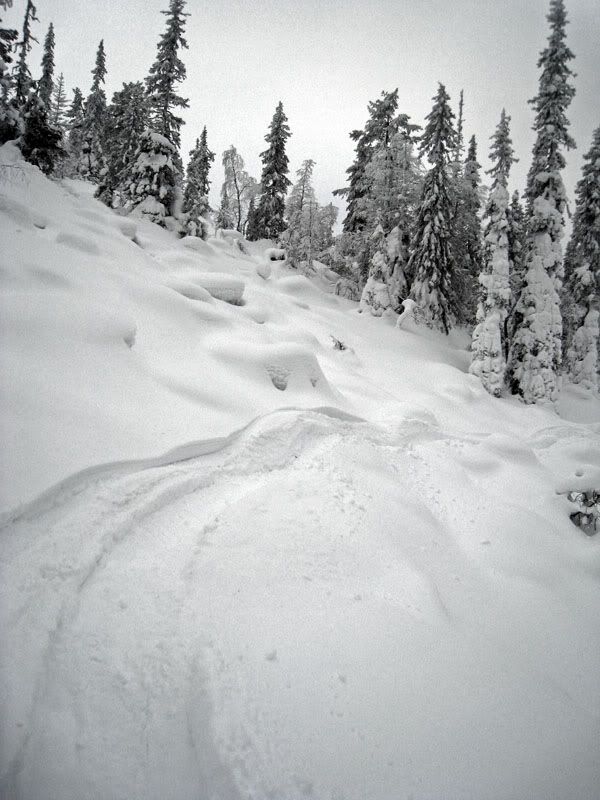 Skippasin tänään työpäivän ja lähin Bryce-duudsonin kanssa kiipiämään Mt. Duvalin päälle. Aurinko paisto aivan timanttina. Kipastiin sellaiset 700 m ylöspäin lumirinteitä kelkan jälkiä seuraillen, ja juotiin litra teetä huipulla. Kattelin ylhäältä työpaikkaa. Siellä kolleegat ahersi mielissään! Matkalla löyty aivan tajuttoman siistejä puuderilumikenttiä ja täydellisiä slouppeja telluille. Duvalin takaa löytyi paikallisten moottorikelkkaleikkiareena, kymmenmetrinen lumilippa ja kaikkia muuta hauskaa.