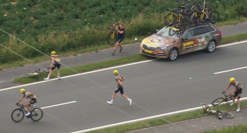 Ainakin Roglic, Ewan ja Haig kaatuivat siinä liikenneympyrässä jossa eristysvillapussilta näyttävä pehmuste oli tippunut tielle kai motokuvaajan pyörän toimesta. Roglic olkapää lähti sijoiltaan. Vingegaard ei kaatunut mutta sen pyörän takavaihtajaan ajoi joku.