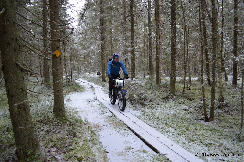Eilen lenkillä oli kaikenlaista olosuhdetta jäisiä polkuja, kesäisiä kuivia pätkiä, ajoittain suht paljon lunta ja vesilätäköitä yms. Hieno iltapäivä ajella auringon paistaessa ja pakkasta ollessa yhden asteen verran ps kesäksi pellekengille hieman nopeampaa rengasta kuin bud lou comboa..