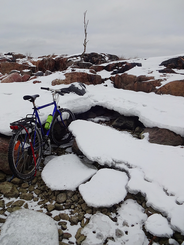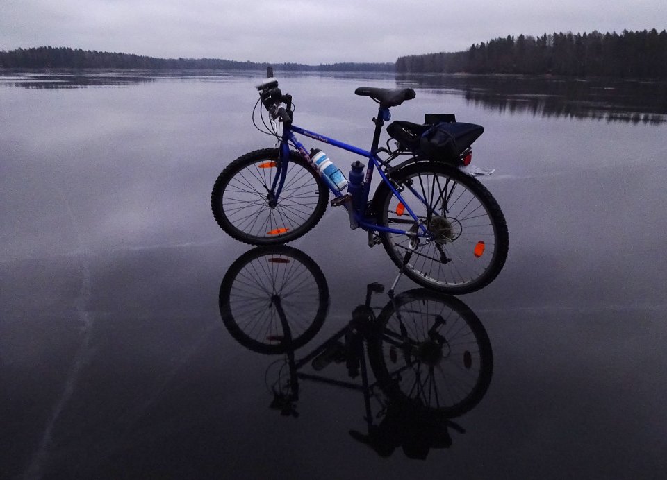 Kai tuo pyörä meni sentään ihan ittekseen tuohon jäälle poseeraamaan vai veikö joku sen sinne ja onnistui jopa hakemaan sen pois kastumatta.