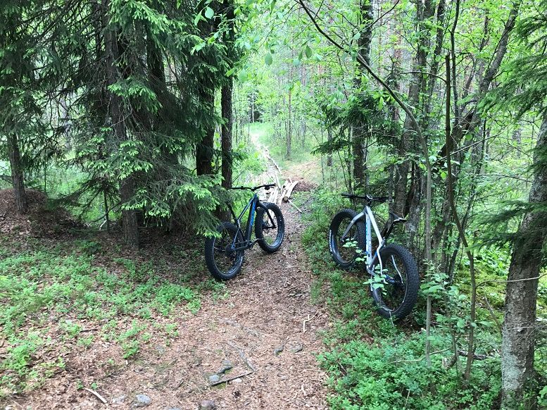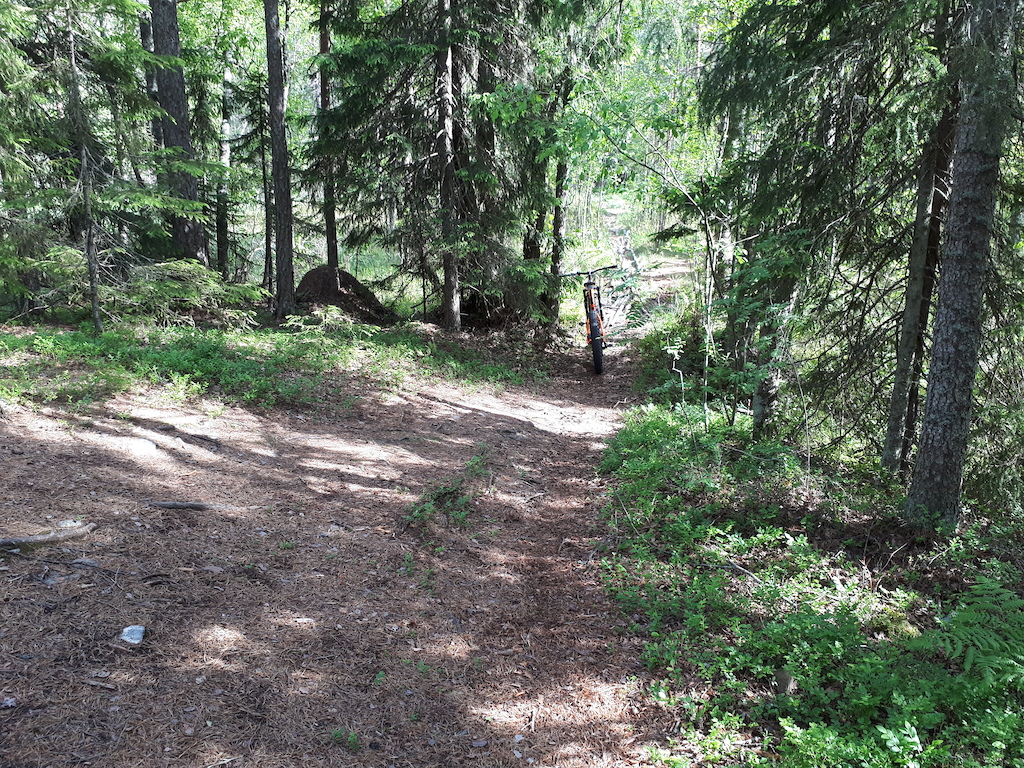 Yli/alivalottunut kännykuva, kuvassa siis: Polku, pyörä ja suo. Vinkki; rasti ollut aiemmin saman polun varrella.