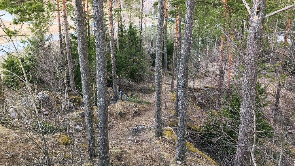 Kävin tänään seikkailemassa läskillä läheisillä ryöneillä. Ilmeisesti supi on tallannut alueen reunat pieniä polkuja täyteen. Tähän alkupäähän pystyi jopa laskeutumaan pyörällä, yleensä reunojen rinteet on paljon jyrkempiä ja kaatuneita puita on sikinsokin edessä.