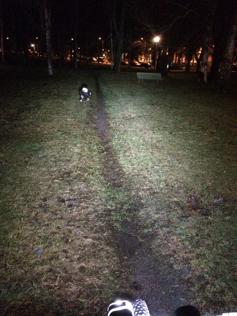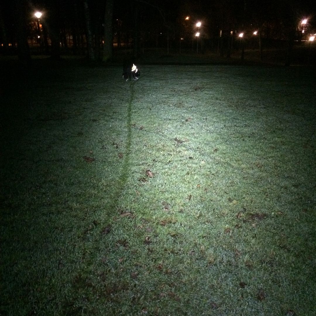 Tuossa pari tuoretta kuvaa hiihtoladunpohjilta juuritulleelta läskeilylenkiltä, valon ollessa täydelläteholla mutta heikolla akkuvirralla. Lampun linssissä tällähetkellä keltainen kalvo joten valo näyttää hieman vihertävältä.