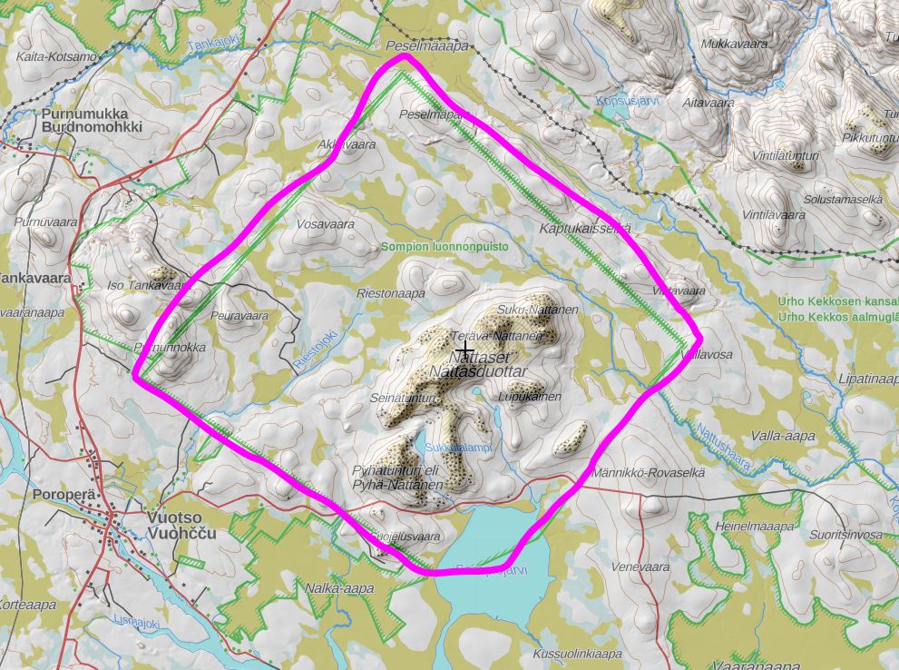 Niin alkaa selvitä, että Sompiojärven alueella Lokan ja Kakslauttasen välissä on varmaankin se 179 neliökilometrin luonnonpuisto johon ne Nattaset kuuluvat. Toinen vastaava alue on Kemihaaran alueella UKK puiston kaakkoiskulmilla. Eli kyllä tuollaiset asiat karttapalveluissa on kuvattu ja tuo Paikkatietoikkuna on aika hyvä selainpohjainen väline niiden katseluun. Tuolta sen virallisen karttamuotoilun näkee, joka vastaa täysin tuota JackOjan korostusta. Joskin tokihan se tuossa karttaotteessa näkyy, mutta kun ne saa Paikkatietoikkunassa päällekäin ja selailtavaksi, niin ymmärtäminen on helpompaa.