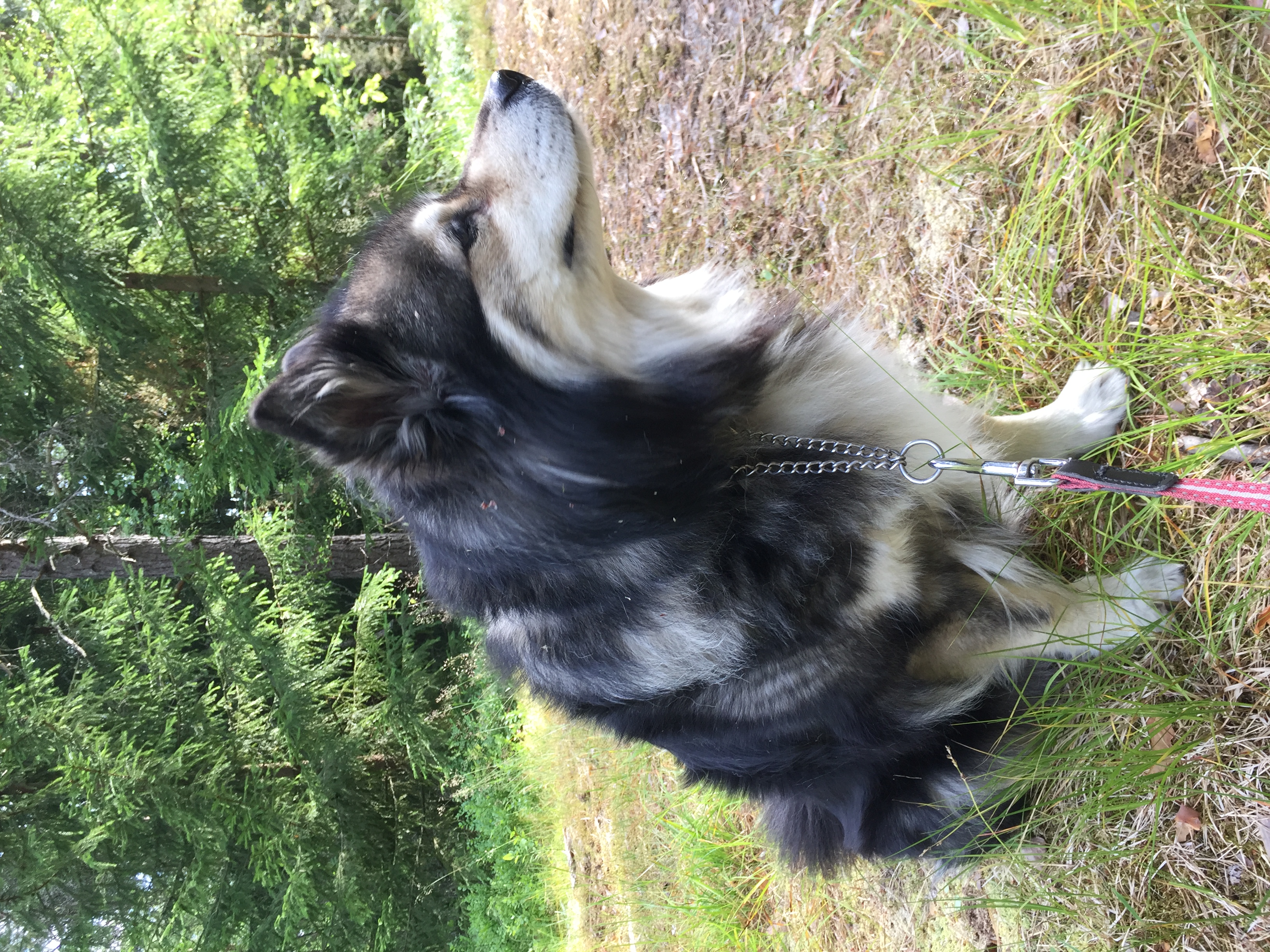 Olin systerillä koiravahtina. Tässä vanharouva, lienee Lapin porokoira. Yllättävänkin virkeä ja leikkisä vielä. Jaksaa kerjätä herkkuja mitä mielikuvituksellisimmilla tavoilla. Itsepäinen kuin mikä, mutta antaa periksi herkun toivossa. Vähän vissiin kaihia silmissä, ei ihan kaikkea näe enää hyvin. Tulee hyvin toimeen lasten kanssa, mutta valitsee "emonsa" (sen, joka ruokkii ja komentaa).