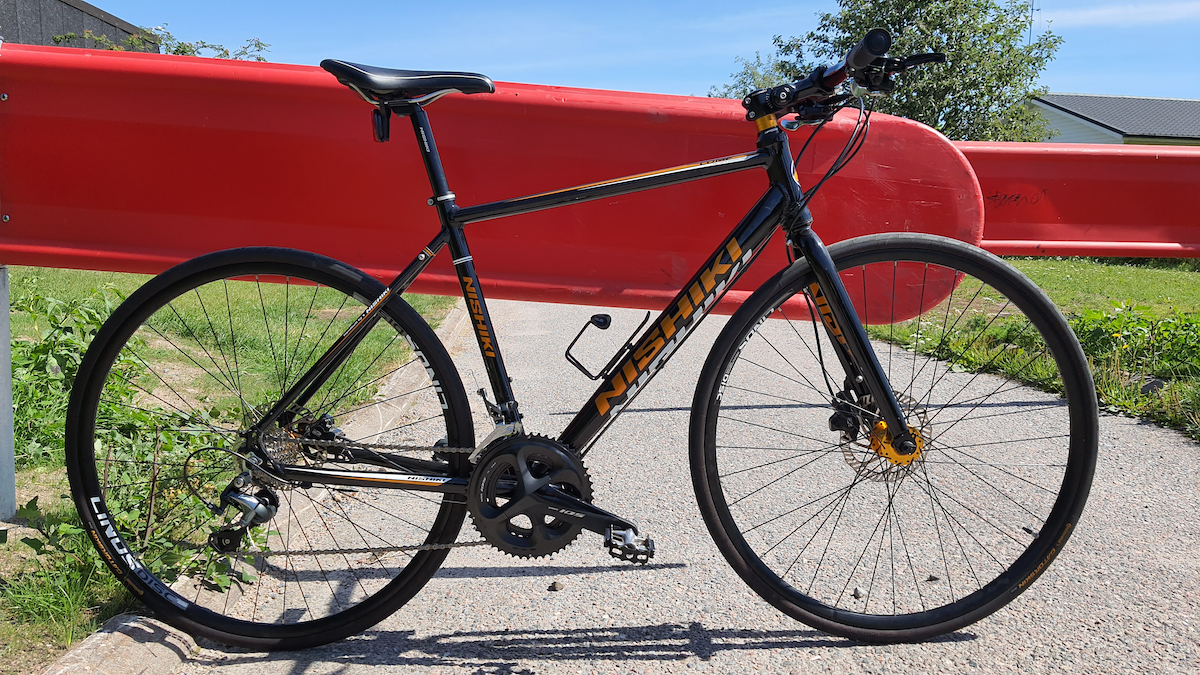 Harrastepyörien ohella tallista löytyy myös tuollainen fillari, jolla sulan maan aikaan tulee hoidettua kauppa-, kirjasto- yms asiointireissut tässä kylillä. Alkujaan vuoden 2012 mallisessa Nishiki Comp:ssa oli Acera/Sora 3x9 vaihteet ja nelikanttikeskiö, mutta koska varaosakaaplssa sattui olemaan sekä 2x10 flatbar -vivut, että 105:n kampisarja, niin päätin sitten vaihtaa ne tuohon Nishikiin. Ostoslistalle siis keskiölaakeri, ketju, takapakka ja Tiagran 10-vaihtajat eteen ja taakse. Yksi ilta askartelua säätämössä ja tulos on tässä: