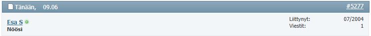 ^ Esa S on kyllä ollut aktiivinen useassakin pyörä- tai pyöräilyketjussa, joten jonkun muun, kenties foorumin tekniikan mysteerioihin liittyvän selityksen joutuu tässä keksimään, jos tuota omituista viestimäärää haluaa ruveta enemmänkin pohtimaan.