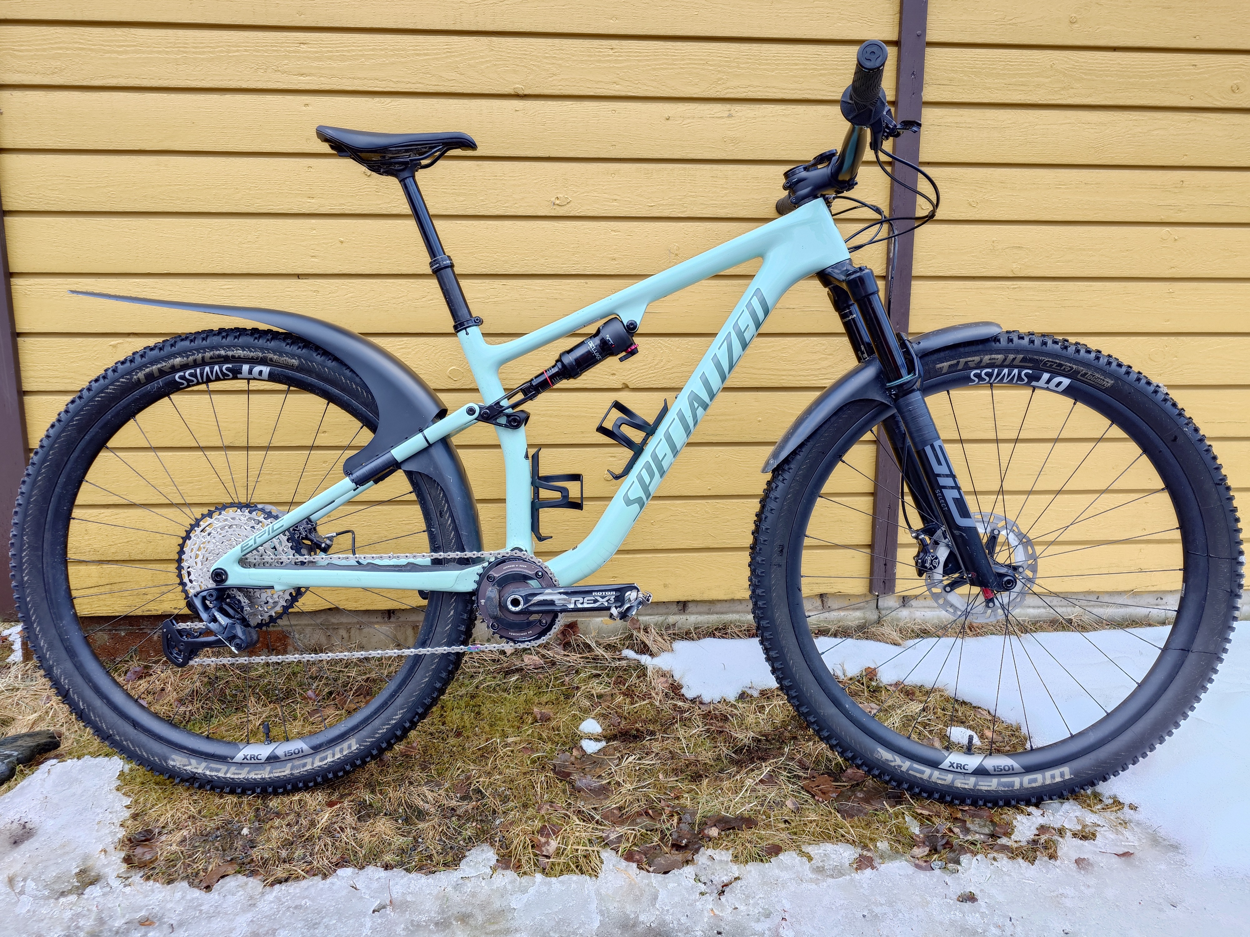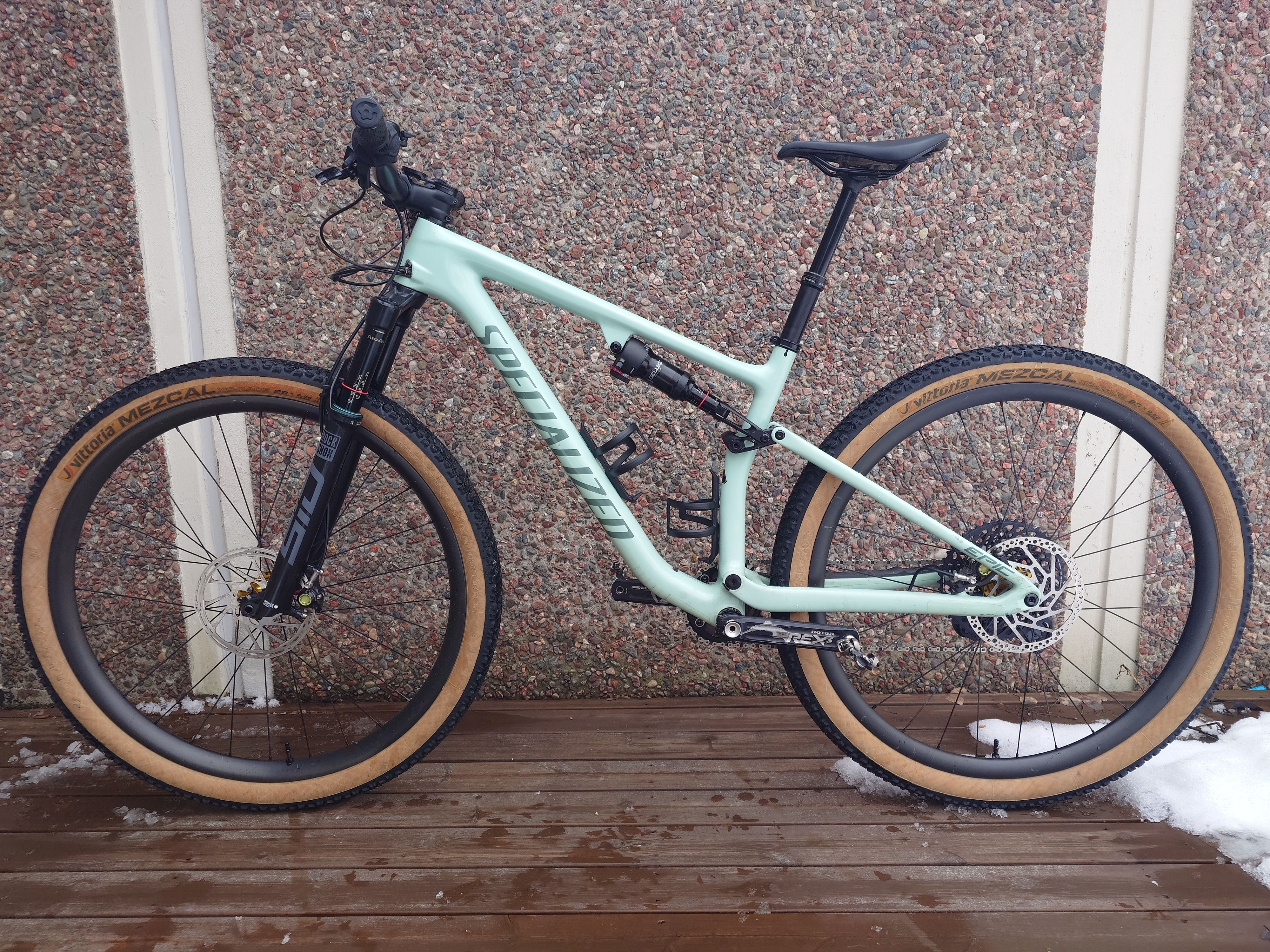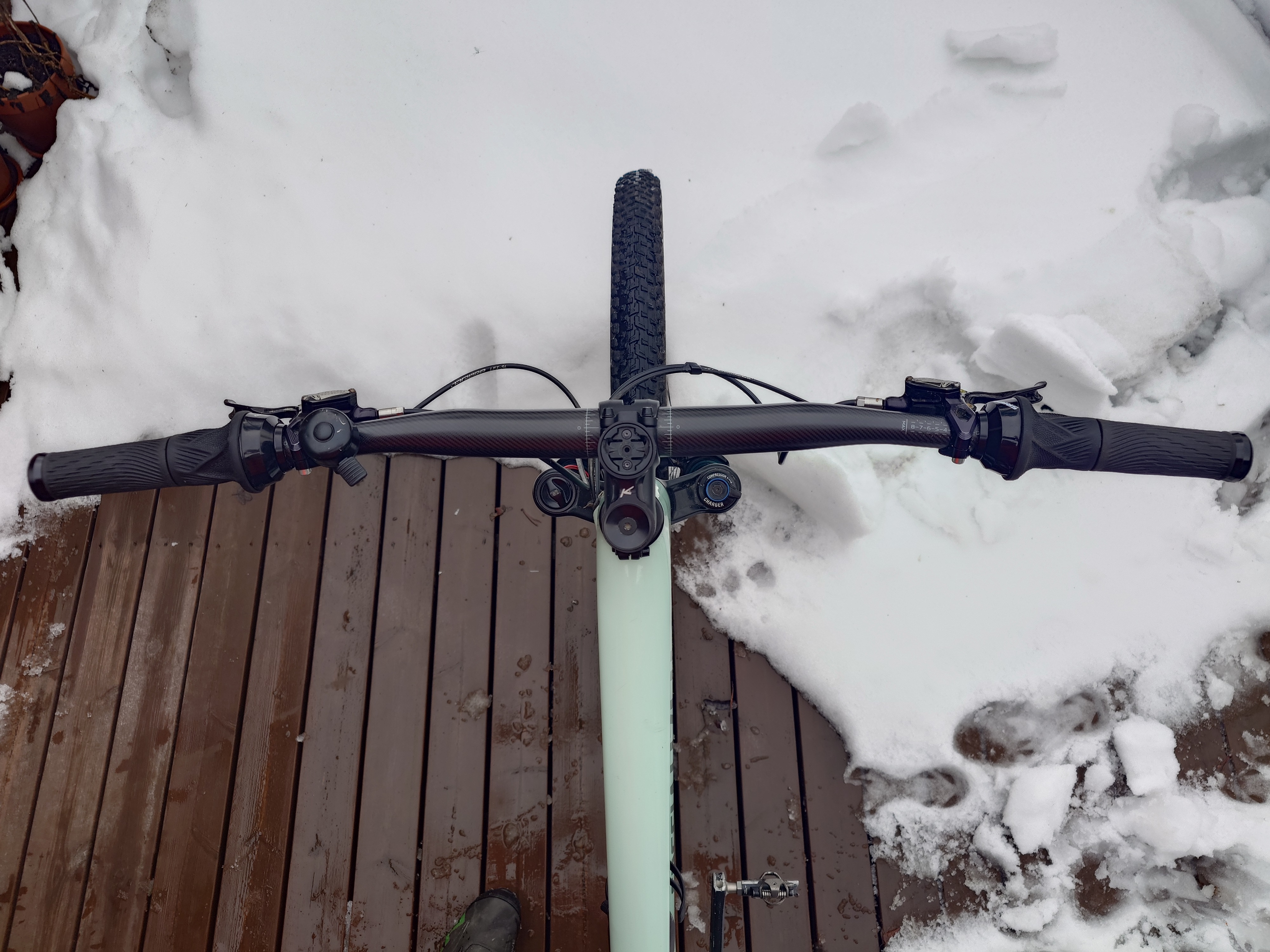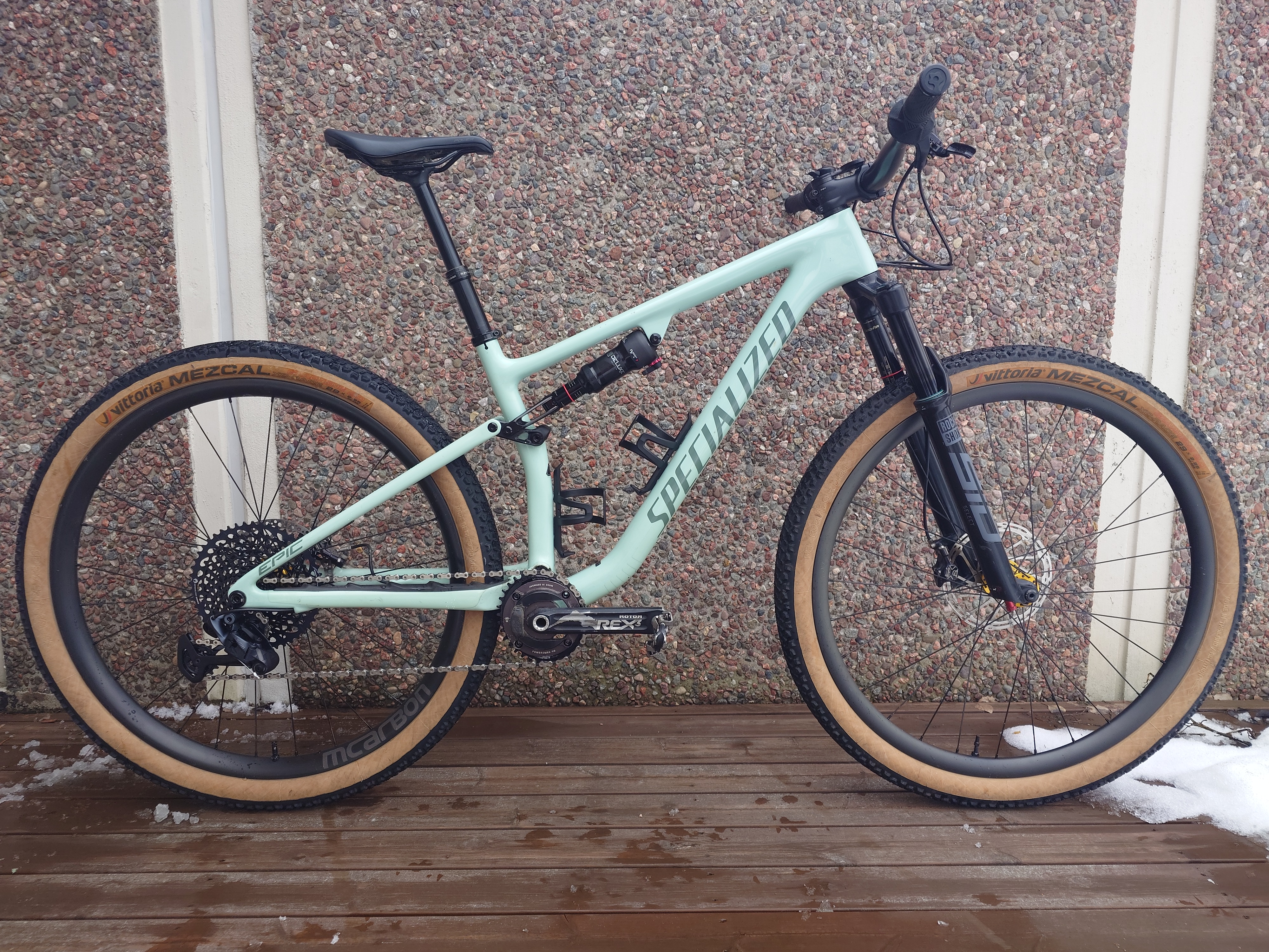 XX1 Eagle 12-speed takavaihtaja, Eagle XG-1295 12-speed pakka, 34t ovaali eturatas, kammet ja tehomittari edellisestä, Hope-jarrut, MCarbonilta kiekot Industry Nine-navoilla, Gripshiftiä käyttöliittymänä. 11,4 kg tässä kuosissa. Käytettynä Fillaritorilta, pikku päivityksillä.