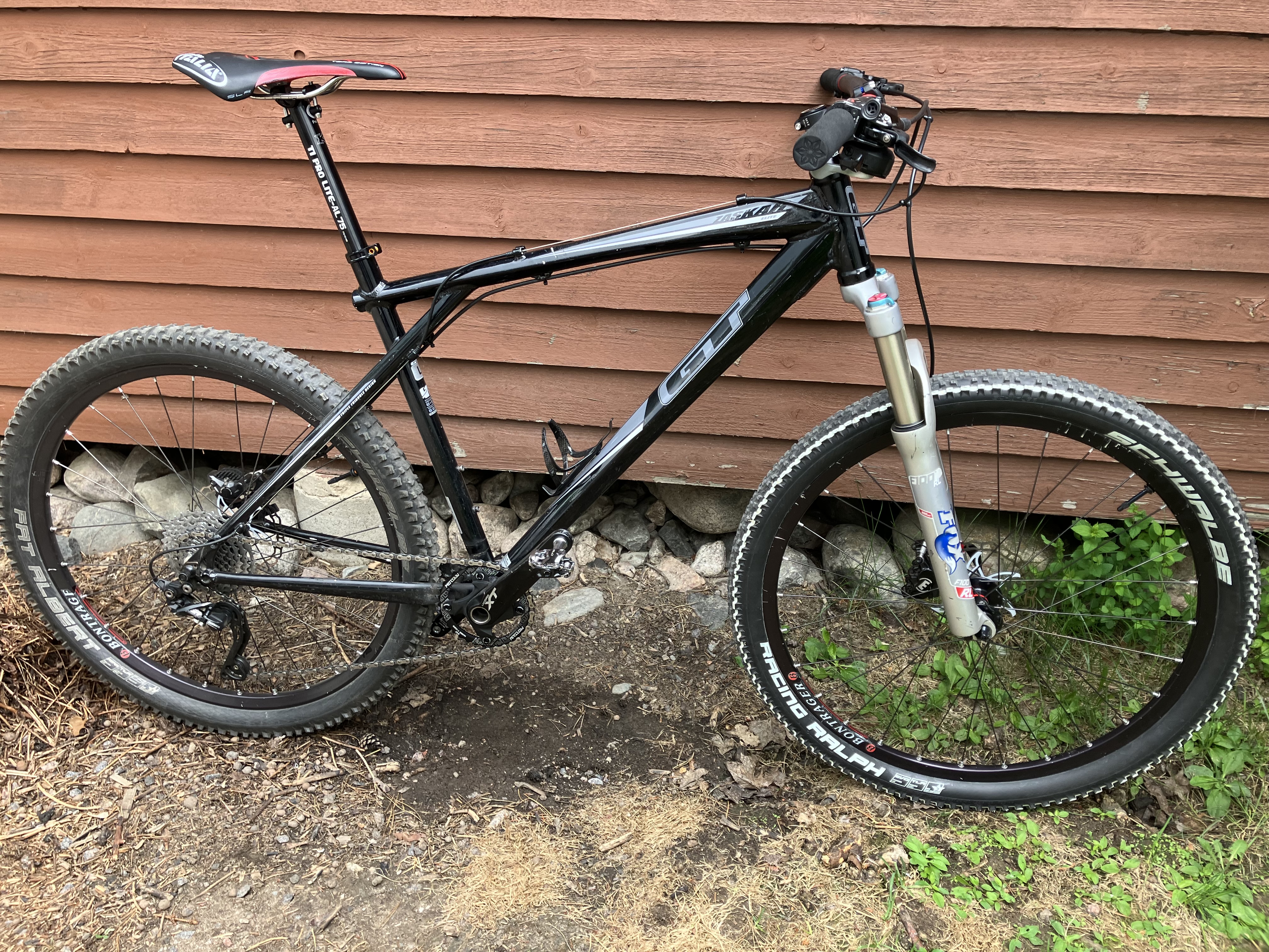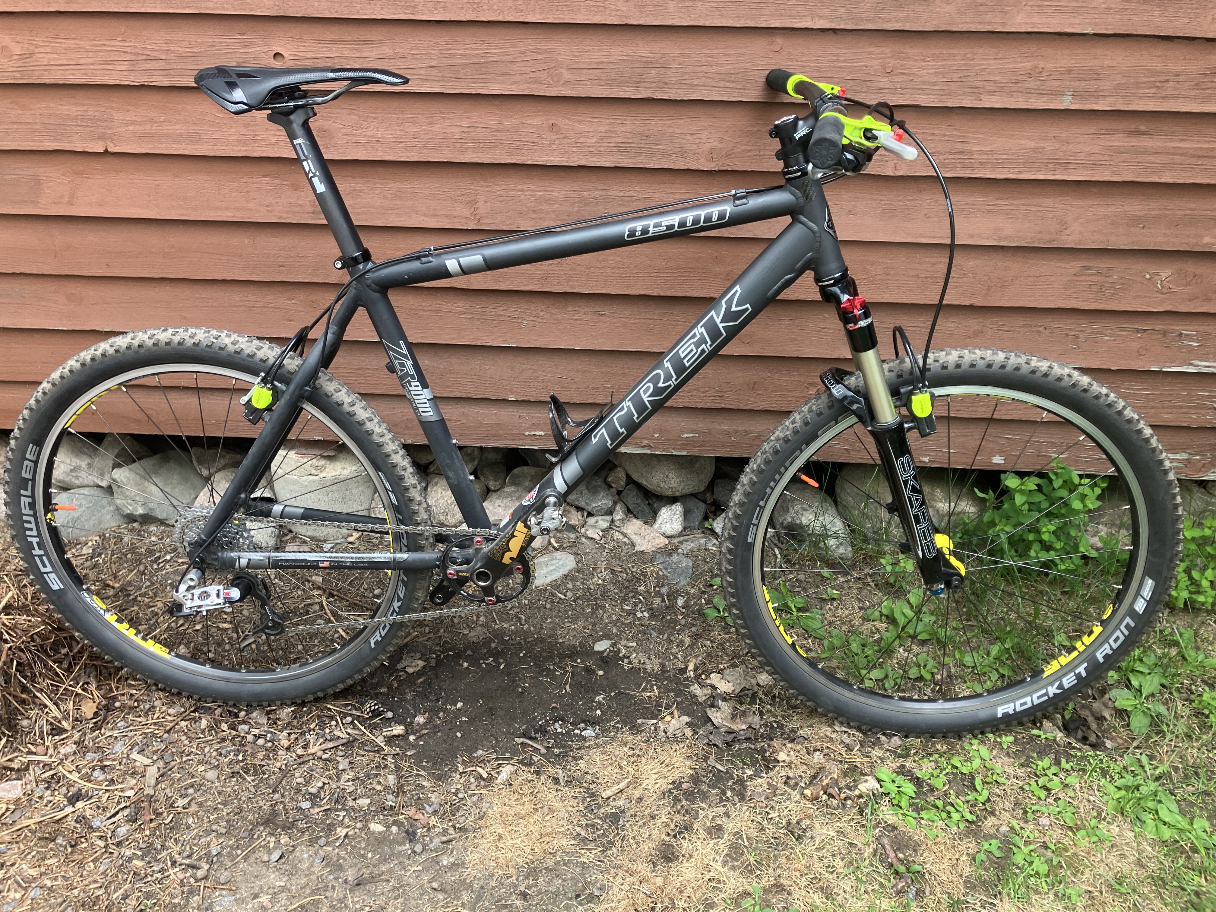 Tässä kuva nykyisestä kokoonpanosta Trek 8500 jäykkäperä 26" vuodelta noin 2002. Painoa 9850 grammaa lukkopolkimineen.