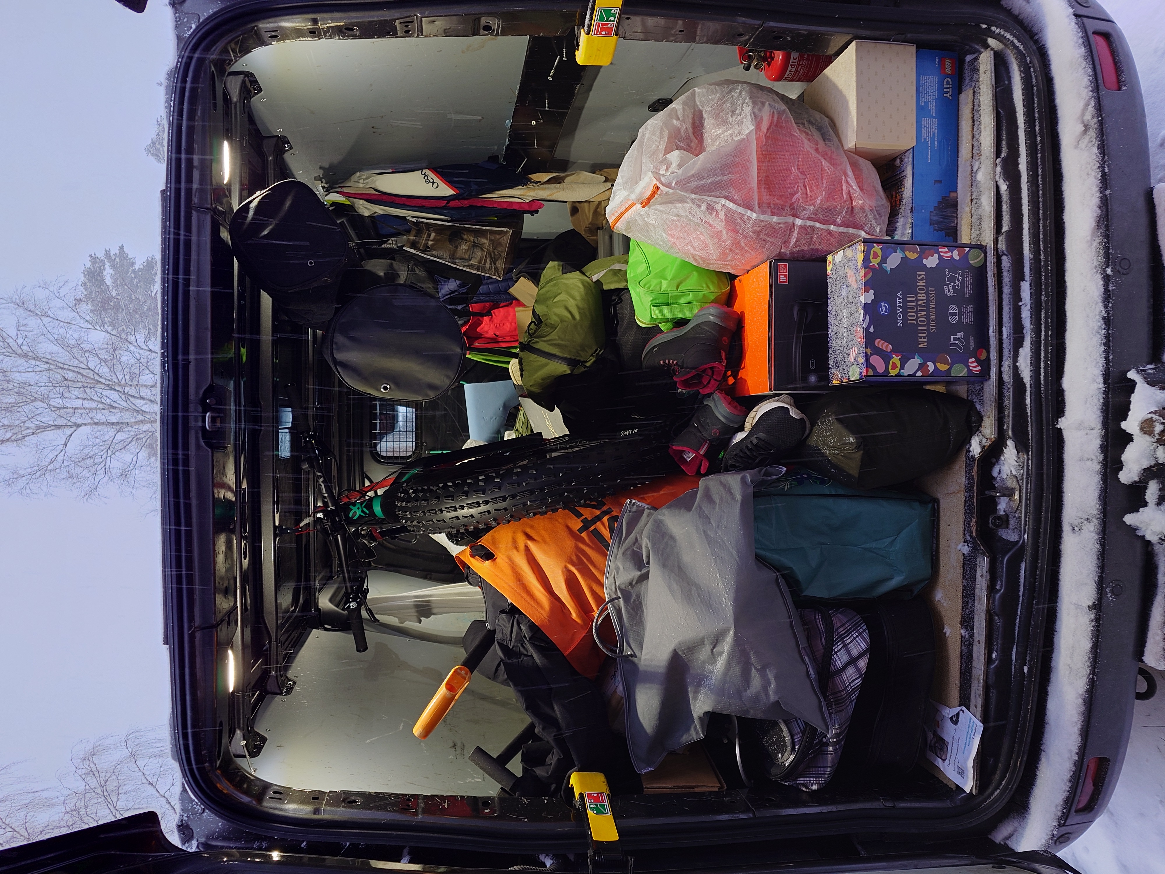 Ai miten niin paljon? Mulla näytti auto tältä aamulla kun lähdettiin pojan kanssa kohti Yllästä. Parin viikon kamat ja ehkä vähän ylimääräistä, mutta mieluummin överit kuin vajarit.https://pic.useful.fi/AlPrJrztn.jpg