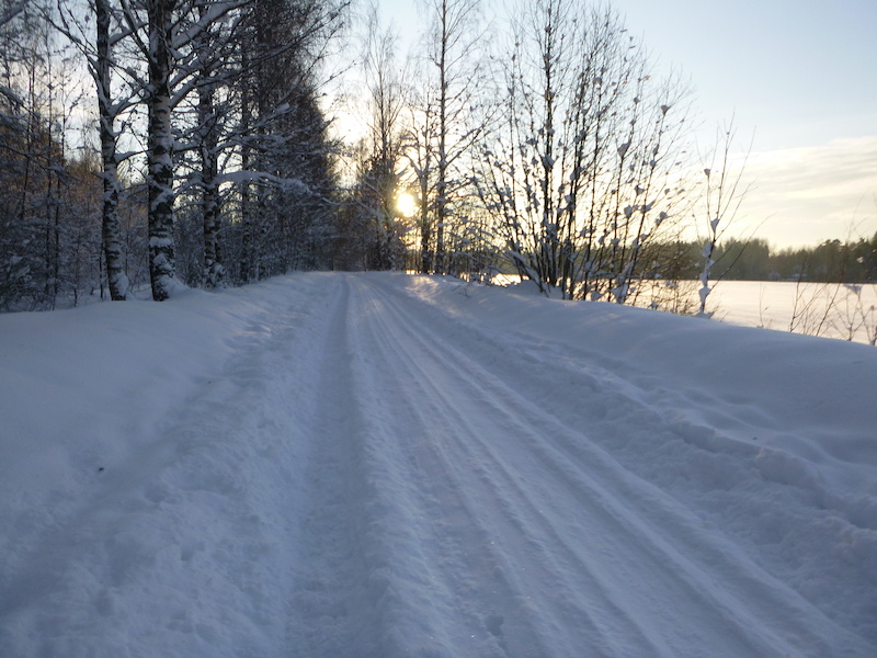 Se on huono juttu se, jos krattorimiäs on käynyt, mutta onneks se krattorimiäs ei ollu ehtinyt kaikkialle. Paremman puutteessa oli kiva ajella Keravanjoen varressa rantaa pitkin menevällä ulkoilureitillä, mihin aikaiset ulkoilijat oli saaneet polun aikaiseksi. Ja kun pohja oli kova, niin siellä missä ei polkua ollut niin vauhtia vaan ja puolen metrin puuterilumeen ajamaan :D
