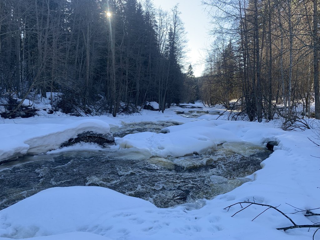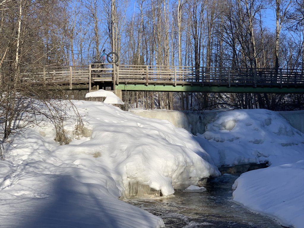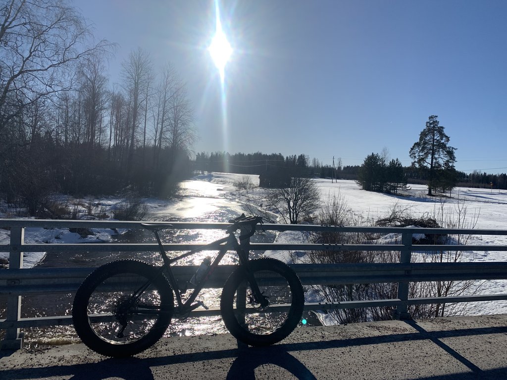 Nyt tuli ekat toisen pyöräilijän jäljet vastaan hangella. Olivat tosin ihan tavallisen maastopyörän. Polulle eksyessäni näky kyllä paksumpaakin jälkeä. Sama ilmiö kun urheiluautojen kanssa, mutta moottoriradalle ei mennä vaikka se oikaisi vieressä nopeammin perille. Tietysti sama kaikessa Suomessa.