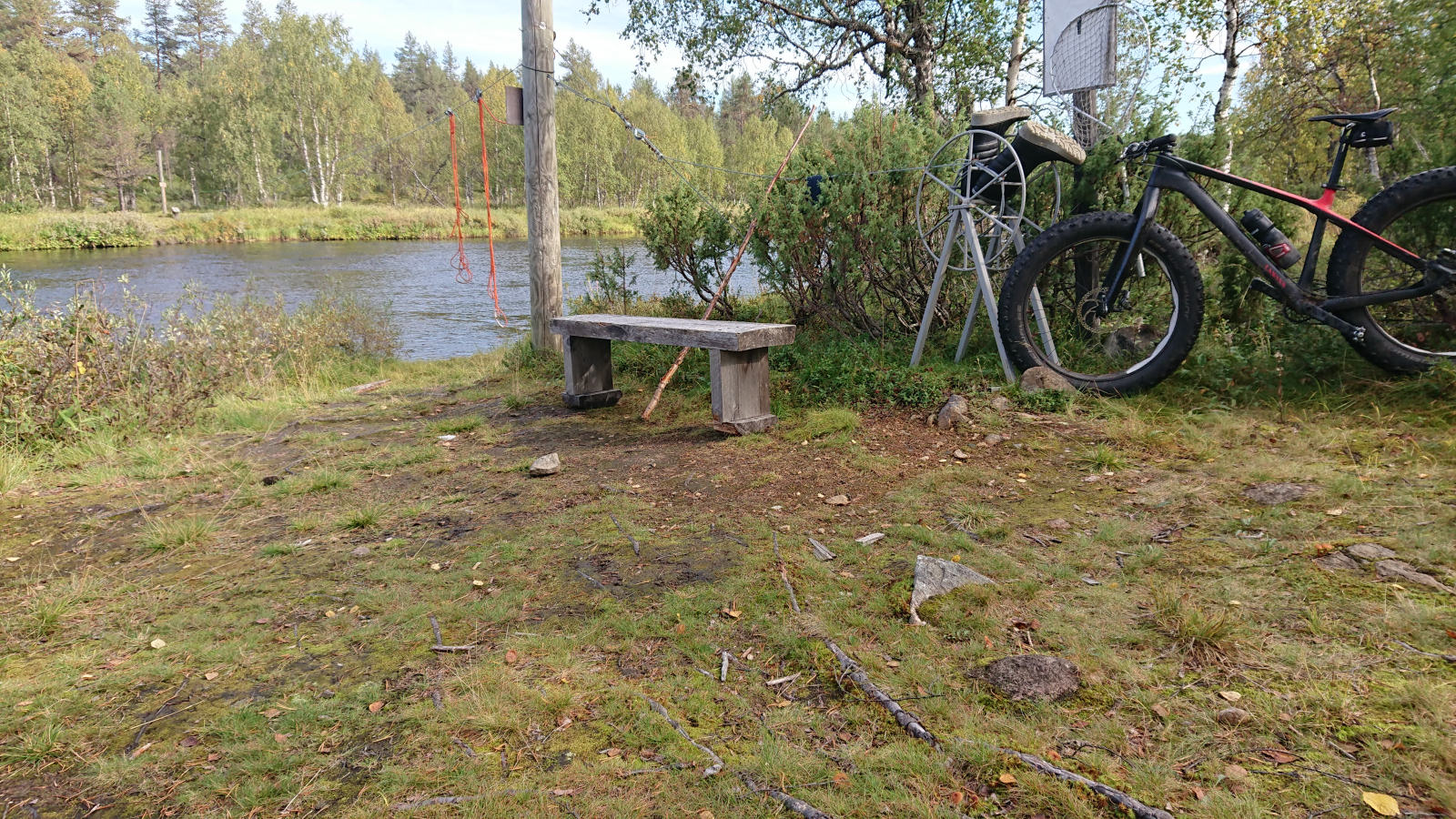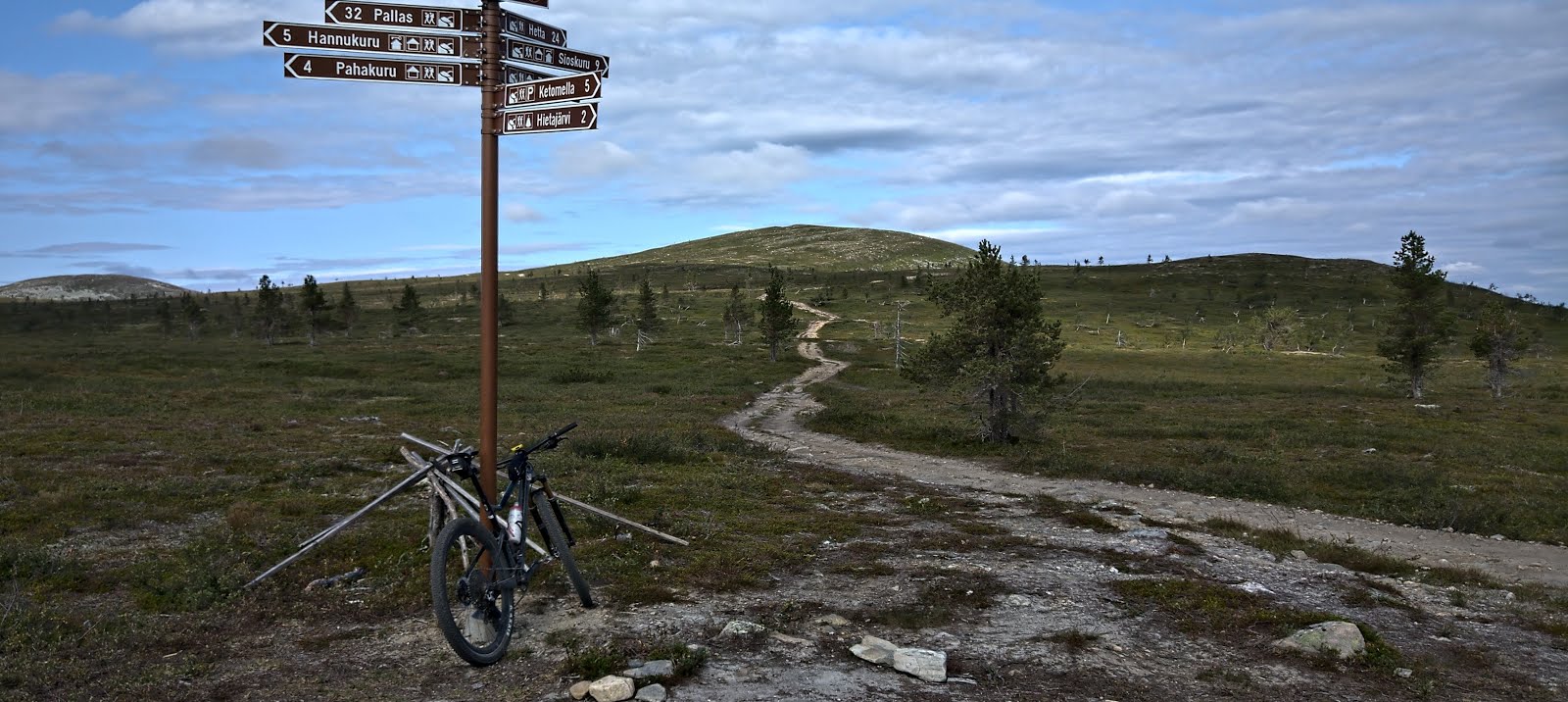 Kyllä, siellähän se. Tuon suunnan polut on muuten paljon mukavampia kuin lähempänä Äkäslompoloa. Nelihenkinen porukka tuli vastaan tuolla. En jäänyt katsomaan, montako matkaa heidän piti tehdä, jotta kaikki pääsi pyörineen yli.