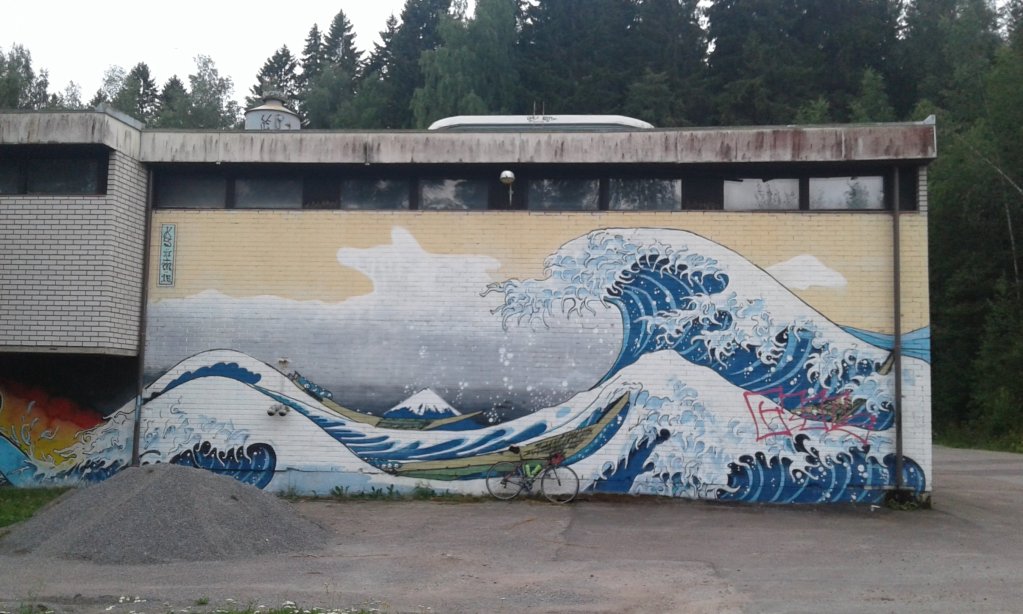 "Peilikuva Katsushika Hokusain puupiirroksesta Suuri aalto (Kanagawan suuri aalto, sarjasta Fugaku Sanjūrokkei – 36 näkymää Fujivuorelle – noin vuodelta 1830) koristaa käytöstä poistettua Kokonniemen pudistamoa alias Kokonniemen pumppaamoa. Taiteilijoina Kim Somervuori ja Teemu Mäenpää."