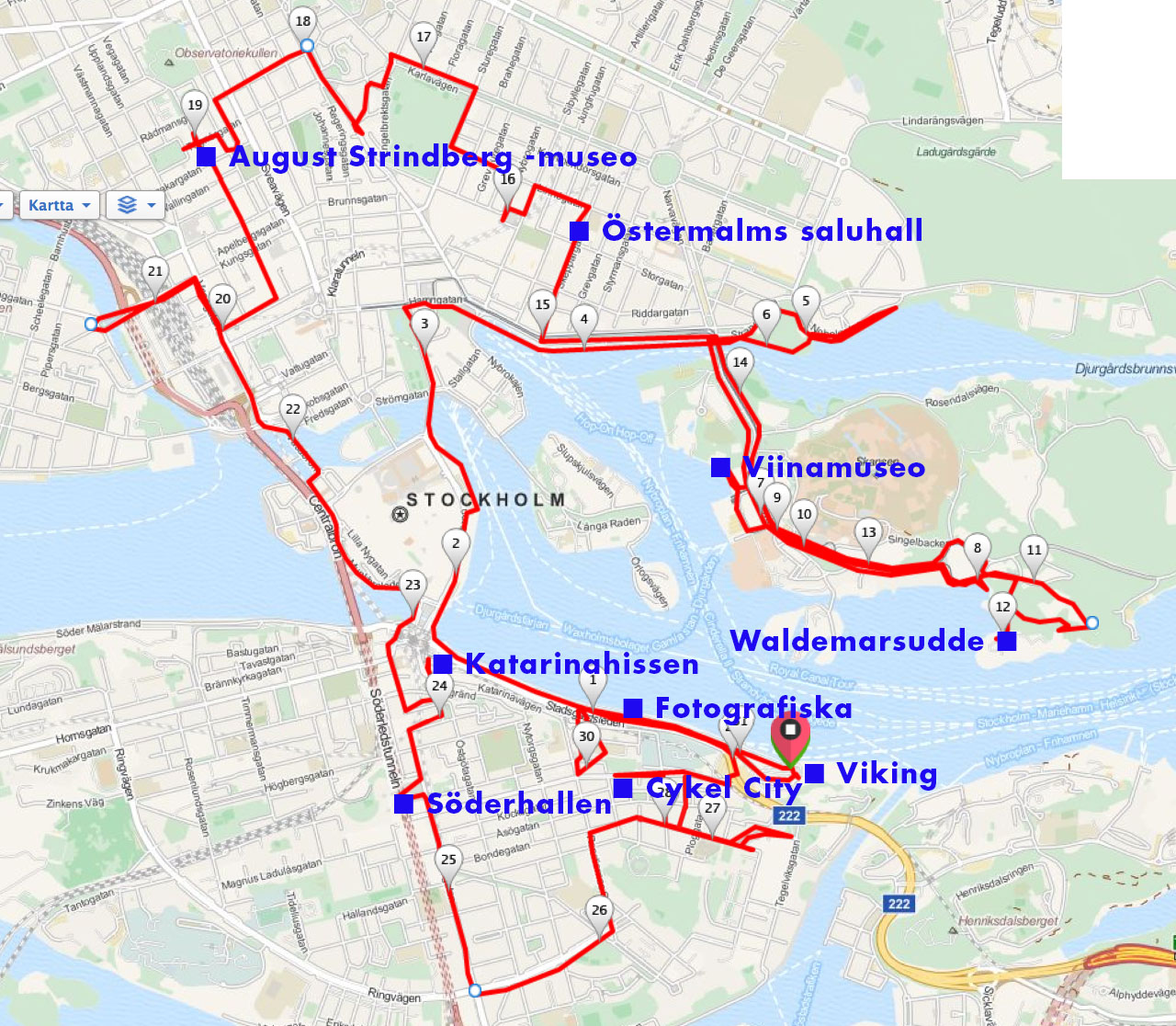 Vikingillä Helsiningistä Tukholmaan ja fillarilla 31 km eri puolelle kaupunkia näyttelyihin ja muuallekin. Kätevä tapa liikkua, kun pääsee ekana ulos laivasta ja pääsee aina ihan oven eteen.