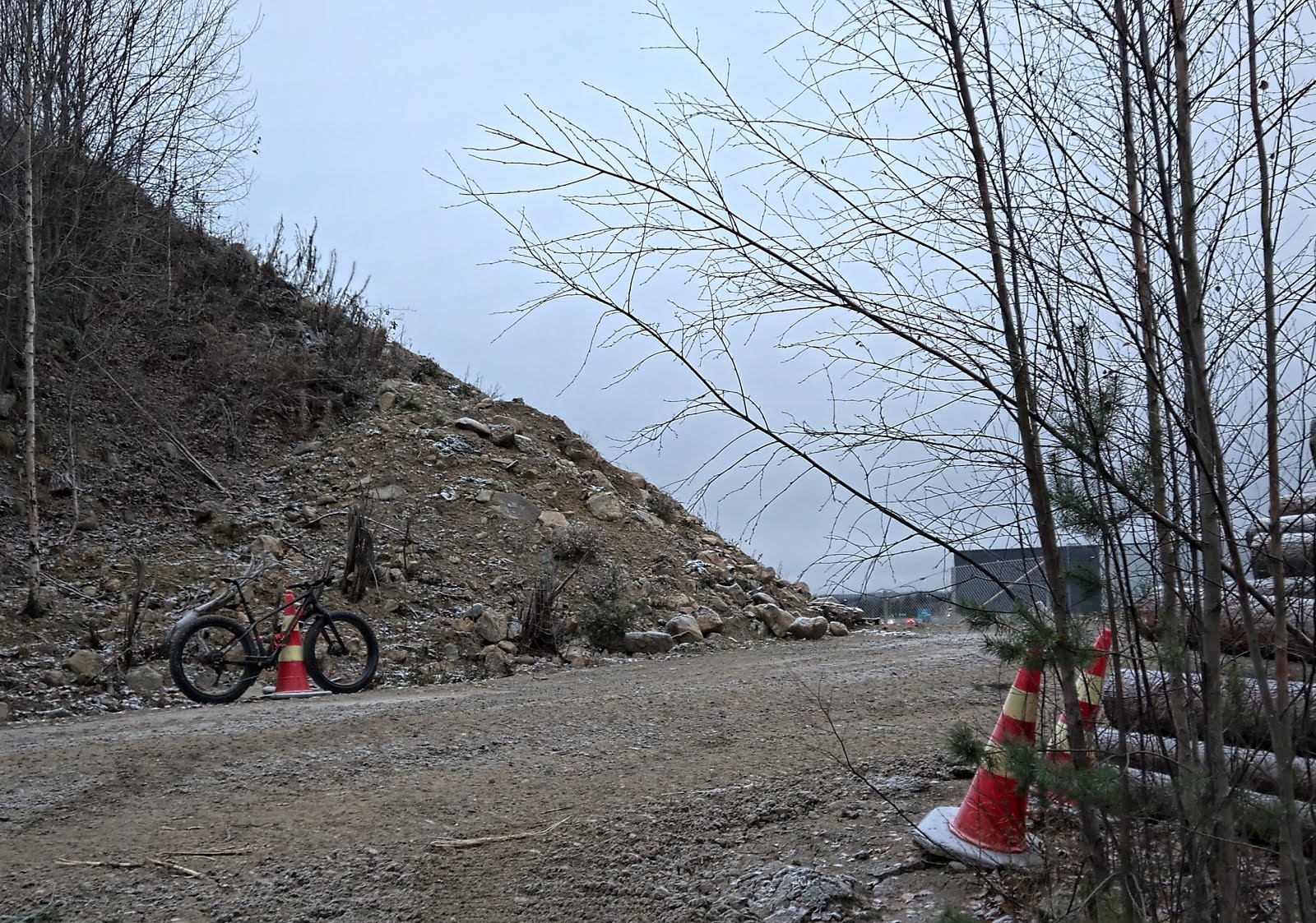 Vinkiksi: Vasemmalla näkyvä mäki on keinotekoinen. Oikealla kuvan ulkopuolella oli kuvan ottohetkellä korkea tukkipino. Edessä olevat ajoneuvot taisivat olla metsurien autoja? Normaalisti tuohon ei pääse autoilla kun puomi paikalle on suljettu..