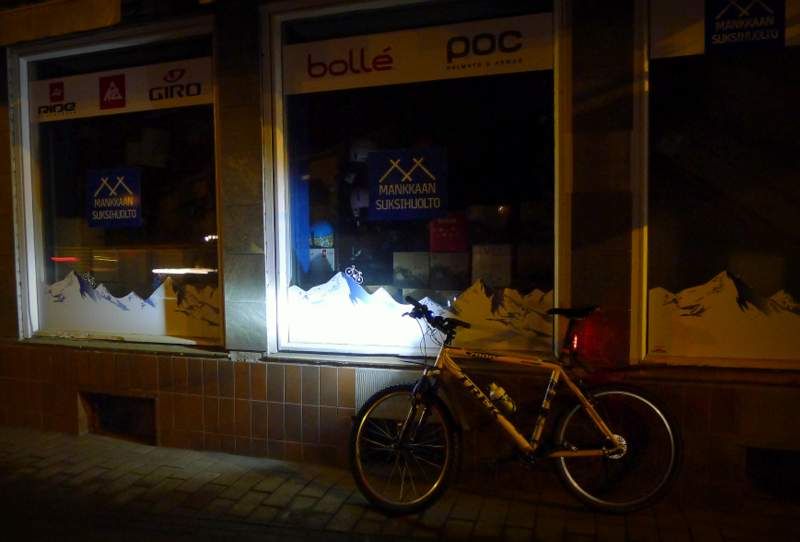Lumihuippuisilla vuorilla pyöräillään Mankkaan suksihuollon ikkunassa Mankkaantiellä.