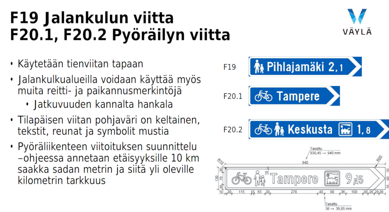 Eilisellä lenkillä tuli useampaan kertaan vastaan tilanne: kulkusuunnassani ajoradan vas. puolella olevalla pyörätien näköisellä väylällä ei ollut pyöreää pyörätien merkkiä mutta sen sijaan oli sininen pikku viitta jossa oli pyörän kuva, kilometrimäärä ja kohteen nimi. Olikohan näissä a) yksisuuntaiseksi muutettu pyörätie josta oli viitta unohtunut poistaa vai b) kaksisuuntainen pyörätie, johon oli unohtunut laittaa pyörätien merkki. Ilmeisesti tuo viitta ei vielä tee pyörätiestä kaksisuuntaista?