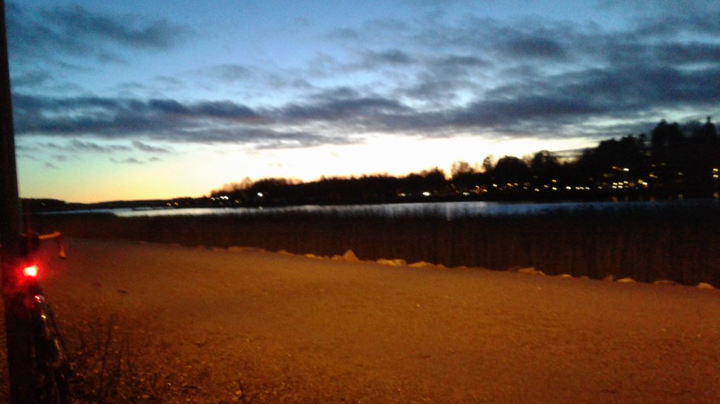 Huono kamera ja vielä huonompi kuvaaja hukkasivat punertavat sävyt taivaanrannasta, mutta ainahan sen fiiliksen voi kuvitella, kun typerän loukkaantumisen - joka ei edes tullut fillarilla liikkeellä ollessa! - takia on joutunut pitämään ajotaukoa kolme viikkoa ja sitten huomaa että paikat taas kestävät ihan kohtuullisesti,