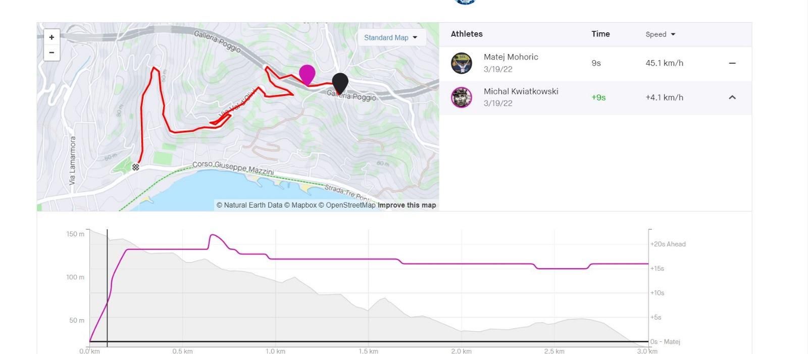 Kun kattoo tarkemmin, niin ei taida olla Stravaan luottaminen. Tai ei mitään saumaa että Mohoric olisi ottanut melkein 20 sekuntia turpaan ekalla parilla sadalla metrillä vs. Kwiatkowski kun oli just tossa kohti ajamassa kiinni siihen keulanelikkoon.