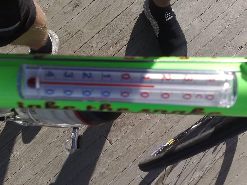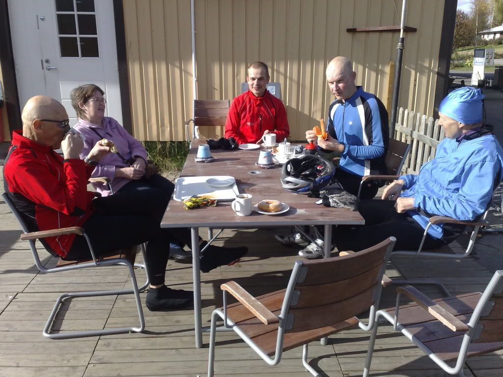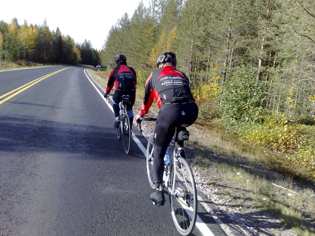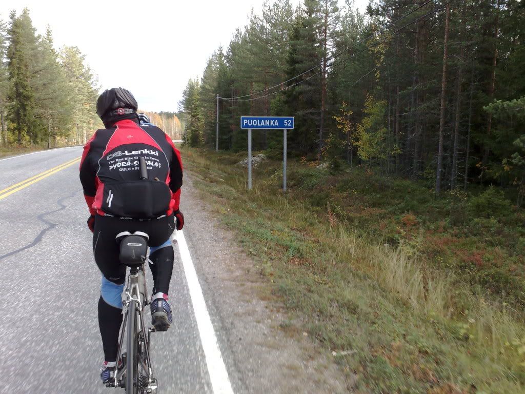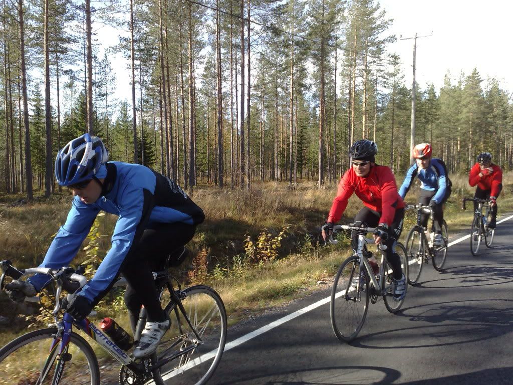Starttasimme Pekan kanssa kaksistaan aamupäivällä Oulun keskustasta. Patelasta joukkoomme liittyi Jaska ja Tuomas. Pohjoisesta Haukiputaalta saatiin vielä Panu mukaan. Matka jatkui Jokelantietä Kiimingin suuntaan. Alakylässä käännyttiin Takalontielle, josta ajeltiin Vt 20:n yli uuden pinnan saaneelle Purontielle. Huttukylässä käännyttiin vasempaan Vesalan suuntaan. Tämäkin tieosuus on jälleenpäällystetty tänä kesänä. Alakoskella pidettiin tauko, jossa pyöräni hieno lämpötilamittari näytti 16 astetta. Kerrassaan hieno ajokeli!