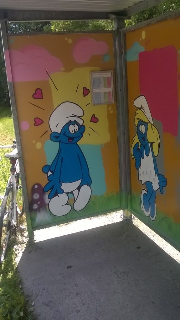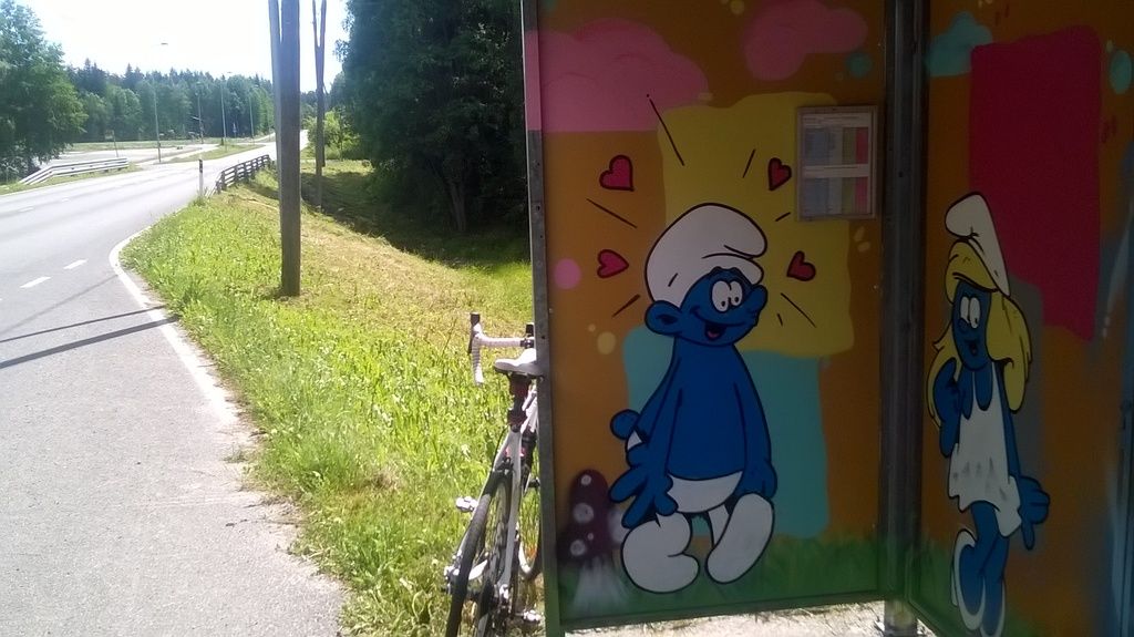Ei ollut hajuakaan, mutta päivän lenkillä sattumalta ajoin ohi. Yleensä tuosta ajelen pyörätietä josta smurffeja ei kyllä näe. Nyt vähän aikaisemmin olleen tietyömaan takia tietä pitkin ajellen huomasin.