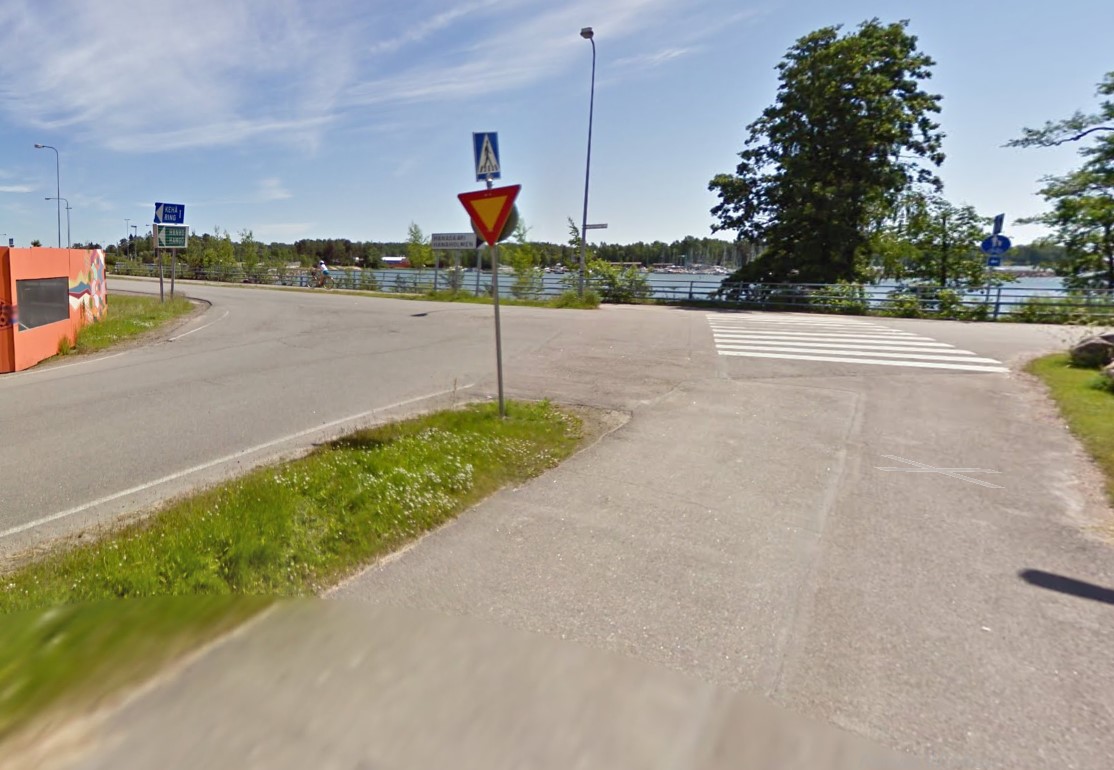 No jos tuosta ajaa pyörällä, niin mieltää ajavansa suoraan Länärin suuntaista reittiä, mutta etuajo-oikeutettu suunta onkin tuo Hanaholmens Kulturcentrum för Sverige och Finland vievä päättyvä katu. Eli kaikki perusteet olisi muuttaa väistämisvelvollisuudet ja geometria siten, että pyöräliikenne olisi etuajo-oikeutettu, koska sellaiseksi sen moni voi psykologisesti mieltää.