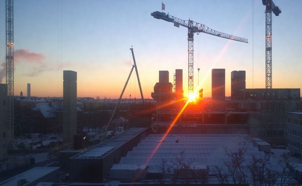 Tällaisen otin viime viikolla toimiston ikkunan lävitse. Teknisiä saati taiteellisia arvoja on turha etsiä. Aurinko vain sattui nuosemaan mukavasti torninosturin juuresta, aamun värit olivat kauniit.