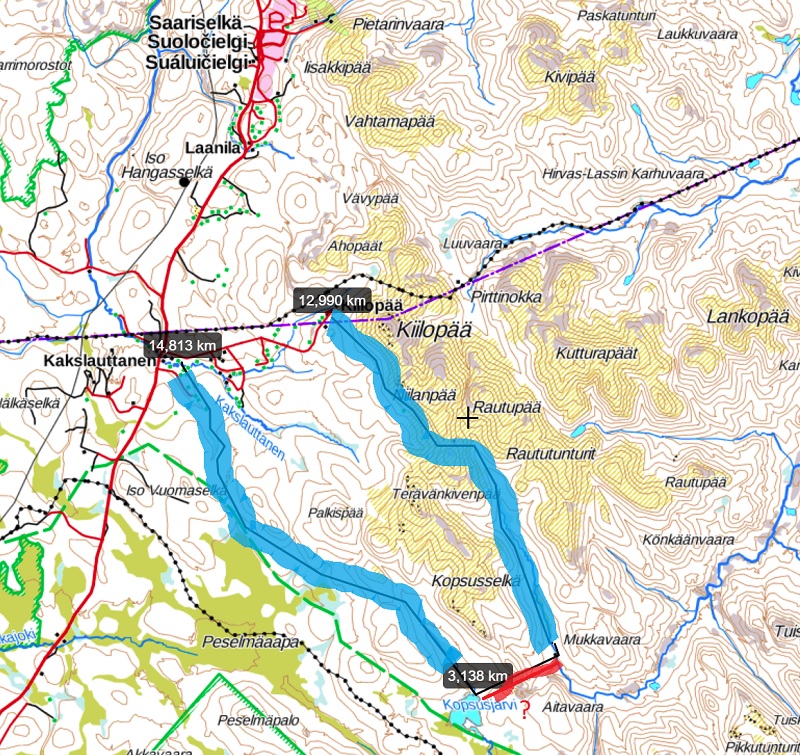 Homma jatkuu Kalottireitin lähellä menevää uraa Suomen rajalle Kobmajoelle. Voisi käydä ilman kuormaa tsekkaamassa Poroharjun, kun se viimeksi jäi tsekkaamatta. Kobmalta en viitsi ajaa Kalottireittiä länteen, koska se on niin huono polku. Poromiesten isompi ura Pitsusjärvelle kulkee vähän pohjoisempana, sitä siis.