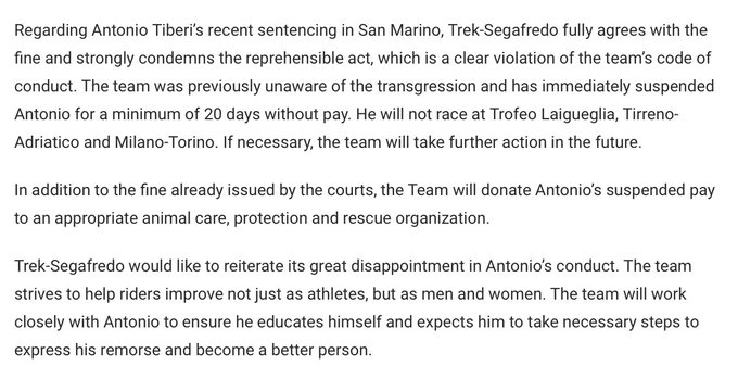 Corriera Della Sera raportoi Trek-Segafredon kuskin Antonio Tiberin tappaneen San Marinolaisen ministerin kissan ampumalla päähän ilma-aseella. Rangaistuksena sakkoa 4000 euroa.