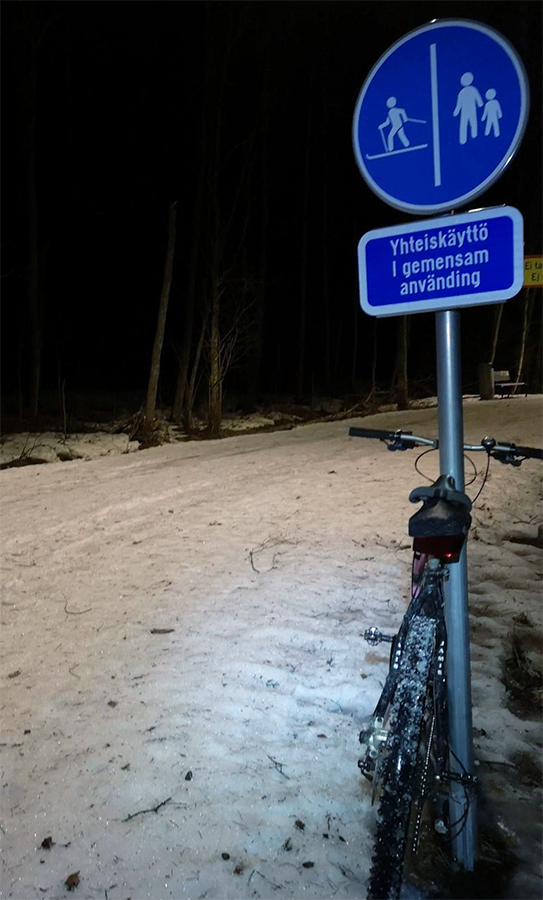 En kuitenkaan aja ladulla, koska en ole maastopyöräilijä eikä minun tarvitse päästä poluille, joille en muutoin pääsisi. Voisin sanoa etten aja ladulla, koska haluan kunnioittaa hiihtäjiä, mutta se olisi tietynlaista tekopyhää hurskastelua, sillä kyse on kuitenkin siitä että minulla on ihan hyviä vaihtoehtoisia reittejä enkä tunne menettäväni juuri mitään, vaikka ladut kieltämättä vievätkin suurimman osan käyttämistäni ulkoilutiereiteistä.