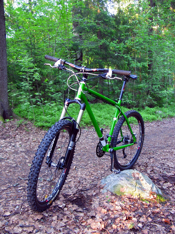 Painoa tuolle mustalle"keijukaiselle" tuli ~11.8kg, joten ei ihan mikään kevein XC-tykki ole kyseessä. Lisäksi pyörän painopiste on hyyyyvin erilainen vanhaan verrattuna, joten takapään hypäytystehot menee uudelleen kalibrointiin :)