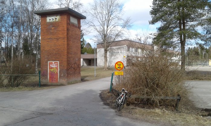 Uusi: Muuntamo (sangen ilmeisen) koulun edessä.