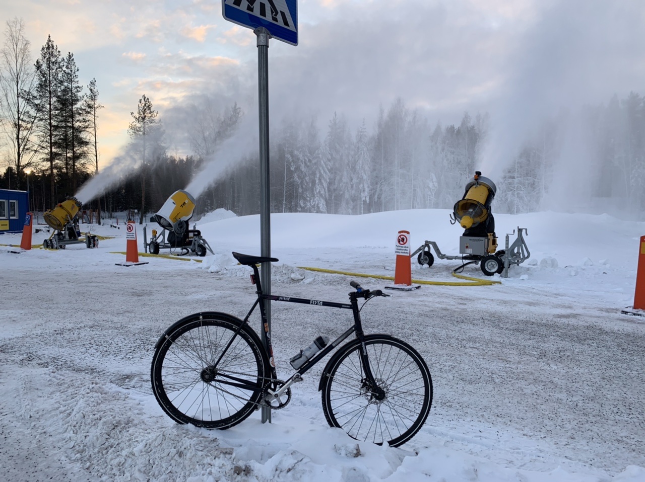 Tunnustan joskus helmi-maaliskuun vaihteessa miettineeni että ovatkohan nämä lumitykit Hyrylässä vai Keinukalliossa - vai olisiko sittenkin jossain joku kolmas tykkilumilatu josta en tiedäkään. Mutta kun hiihtokärpänen oli päässyt puremaan ja fillarointi jäänyt kokonaan, en sitä sen enempää viitsinyt pohtia enkä hakea, saati sitten lähteä oikealla kuvarastipyöräilymeiningillä paikan päältä tsekkaamaan.