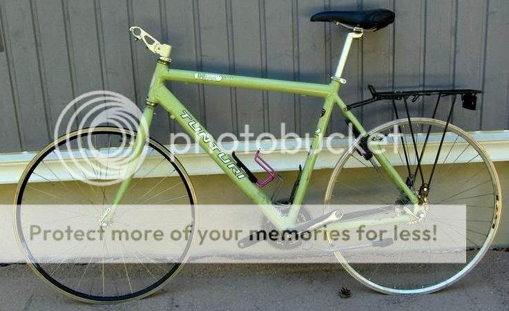 Käytttynä ostettu Tunturin H-sarjan hybridin runko/raato. Siltä ajalta kun Tunturi kokosi fillarit vielä Suomessa. Eli vähintään 5 vuotta vanha (kokoonpano siirretty muualle 2006). Edullisesti tosiaan sillä perustein että suuri osa osista oli nurkissa ylimääräisinä pyöriviä. Uutta on ketjut, vaijerit, vaihdevivut, jarruVIPU ja teline. Sanoisinkko n. 130-140e. Runkoon ja keulaan vedetty spraylla yks pullo primeria ja toinen mattamustaa.