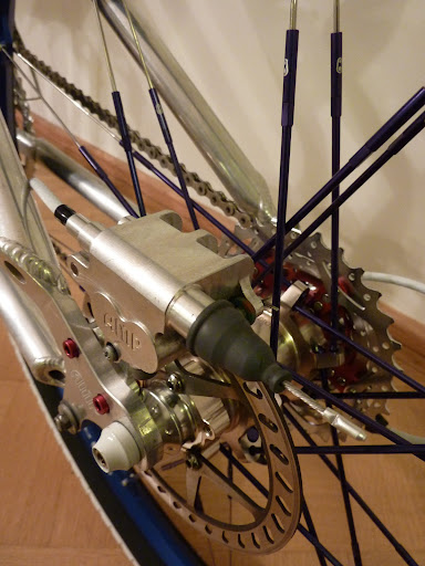 Aika hieno siitä tulee :). Pääosin pyörälle riittää vahaus ja metalliosien kiillotus, uudet renkaat, satulan ehostus ja uudet vaijerit ja ketjut. Levykiekon vuoksi takarenkaan täyttö ei onnistu normaalipumpulla, vaan siihen pitää olla joko kulma-adapteri tai sitten letku, joka ujutetaan levyssä olevasta reijästä venttiiliin.