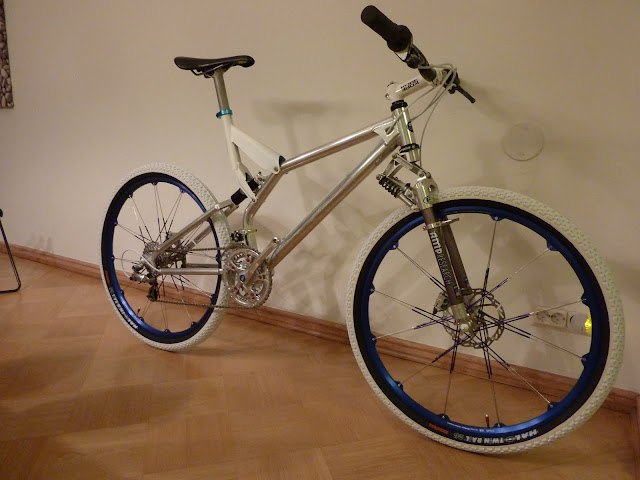 haha, löysin veljen pinkbike-arkistosta yhden väliaikaiskokoonpanokuvan mun projekti LavaDomesta, tosta tilanteesta siis karsitaan pois vaihteet, joustokeula ja etulevari, kootaan siis sinkulaksi, mutta v-jarruilla, niitähän ei alunperin ollut, mutta.. on se vaan kivan letkeä runko =))