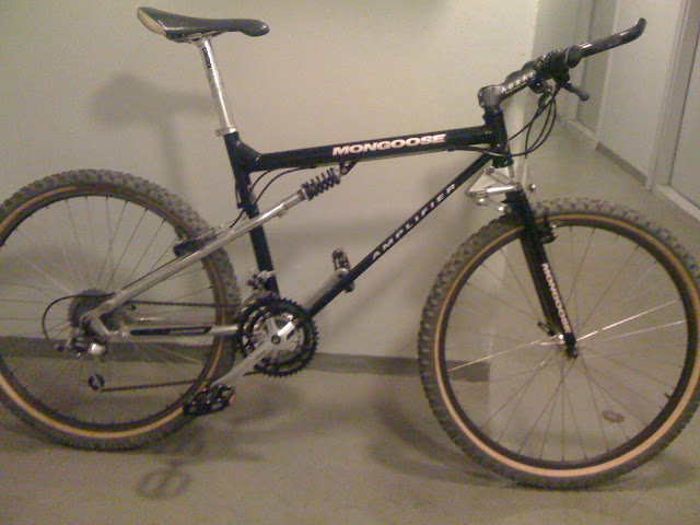 Elikkä, kyseessä on Ibis Mojo, jostain -90 luvun puolivälistä. Pyörän historiasta sen verran, että Ransu on sen tehnyt vissiin ensimmäisten nettisivujensa tekijälle ja pyörä päätyi erinäisten vaiheiden jälkeen Helsingin Aggioon myytäväksi ja sieltä se sitten ostettiin talteen. Pyörässä oli ostohetkellä kiinni varsinainen sekamelska osia, mutta ajokuntoinen se oli ihan täysin. Pahaksi onneksi hävitin jotain alkuperäisiä osia heti ostohetkeä seuranneessa kunnostuksessa, mutta onnistuin haalimaan joitakin takaisin.