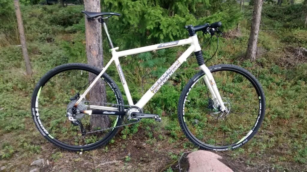 Runko on hajonneesta kasaan hitsattu -01 Cannondale F900SL (1750g), keula on headshok ultra, kammet ja jarrut ovat slx:ää, voimansiirto on muuten xt:tä. Kiekot ovat dt swiss x1900 29" ja kumit ovat 33mm rocket ronit. Satulatolppa on Cannondalen Save ja tanko joku 580mm eastonin alu. Ajokuntoisen paketin paino on 9960g. Vähän on kyllä ristiriitaiset fiilikset pyörästä. Pyörä kulkee kevyesti ja on kivan näköinen, mutta keula on pomppukeppi (pitäisi huoltaa, vapaaehtoisia?) ja renkaat tuntuvat kovin kapeilta. Eteen ei mahdu yhteen leveämpi rengas, mutta taakse voisi mennä joku 1,75-1,85" 29-kumi. Siinä ja siinä vaihtaako koko runko 29":iin vai laittaako vain tähän joku vähän parempi keula (esim. 26-27,5" sid xx).