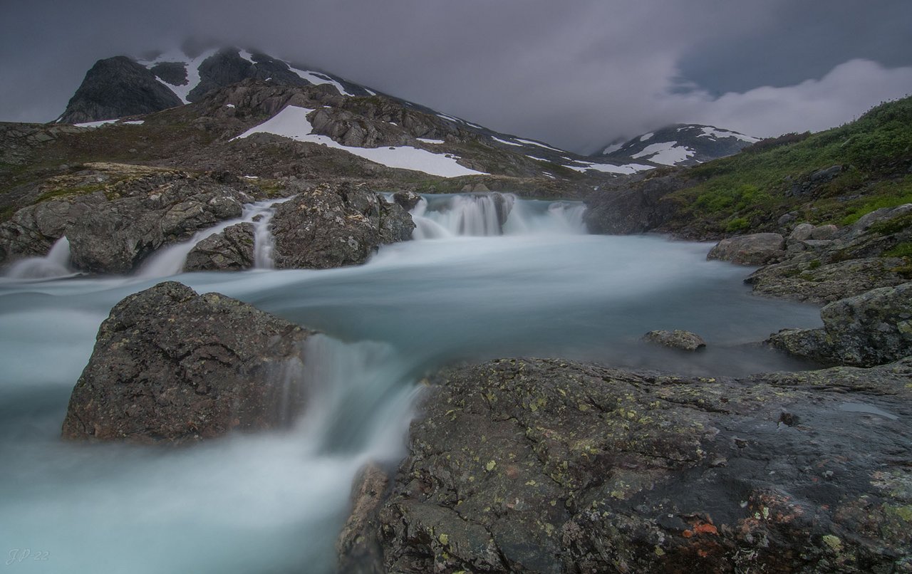 Koldedalsvatnetista tuleva puropahanen, taustalla Falketind kylläkin sumussa