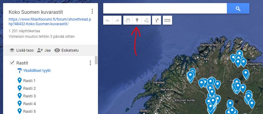 Sitten etsit oikean paikan ja täppäät työkalulla rastin siihen. ÄLÄ siirrä vanhoja rasteja karttaa siirrellessä. Se on erittäin helppoa tehdä vahingossa.