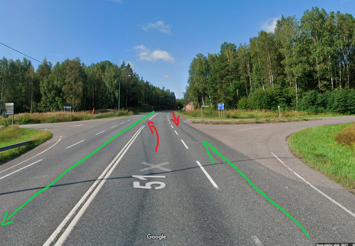 ^Mä en kyllä uskaltaisi tuollaisessa pysähtyä maantielle. Olisin kiertänyt tuolta oikean kautta liikenteenjakajan ja ylittänyt risteyksen suoraan.